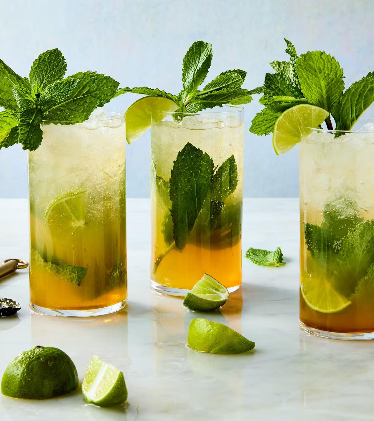 Top off with ice. Garnish with mint sprigs and lime wedges.