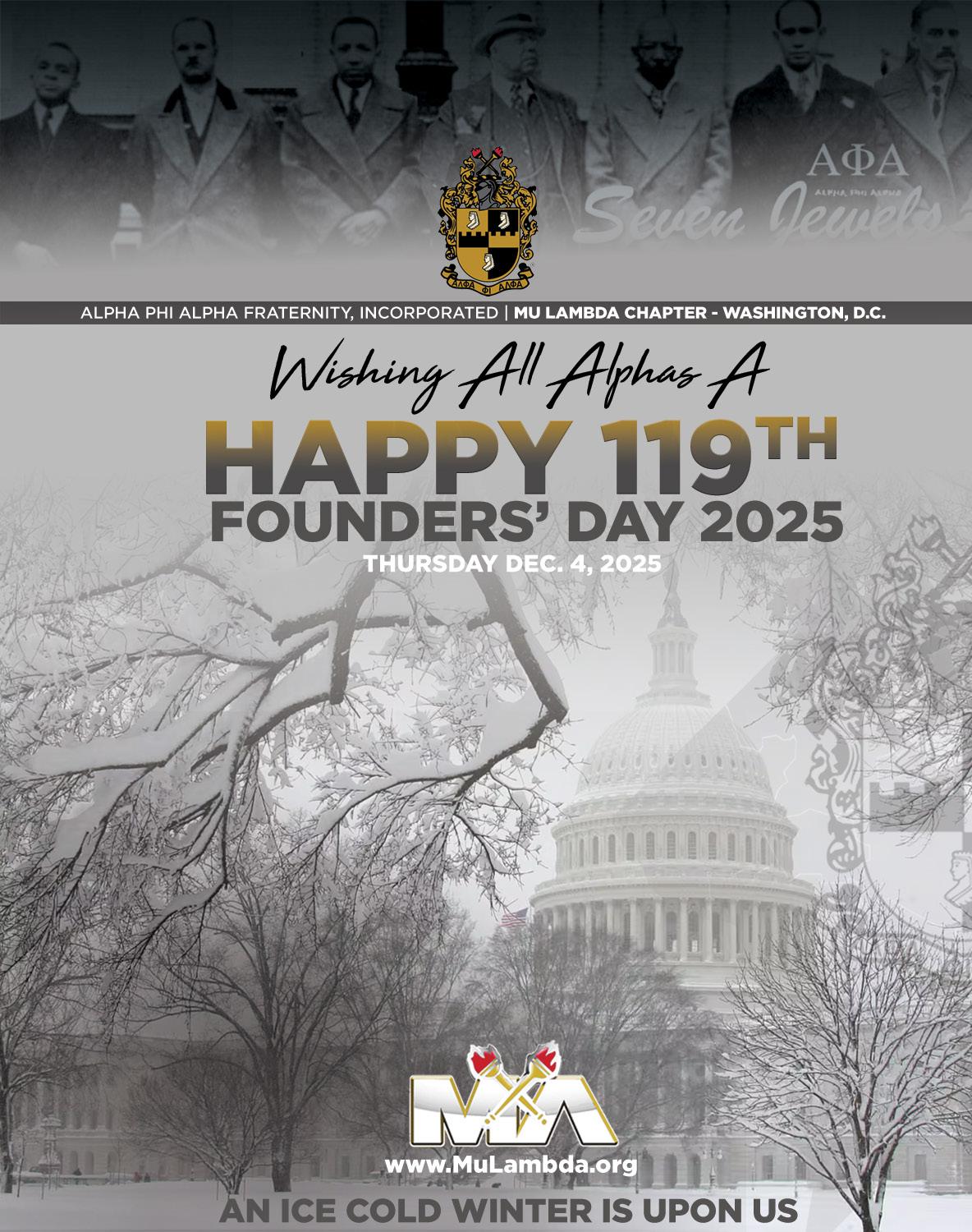 Mu Lambda is Alpha's eleventh alumni chapter, chartered October 1, 1923, in Washington D.C. The chapter was established, in part, in response to the desire of graduate brothers, many whom were initiated into Beta Chapter at Howard University, to give aid to the undergraduate brothers and continue the work of Alpha. Chartered by 22 distingushed men of Alpha which included Jewel Nathaniel Allison Murray and Jewel Robert Harold Ogle.