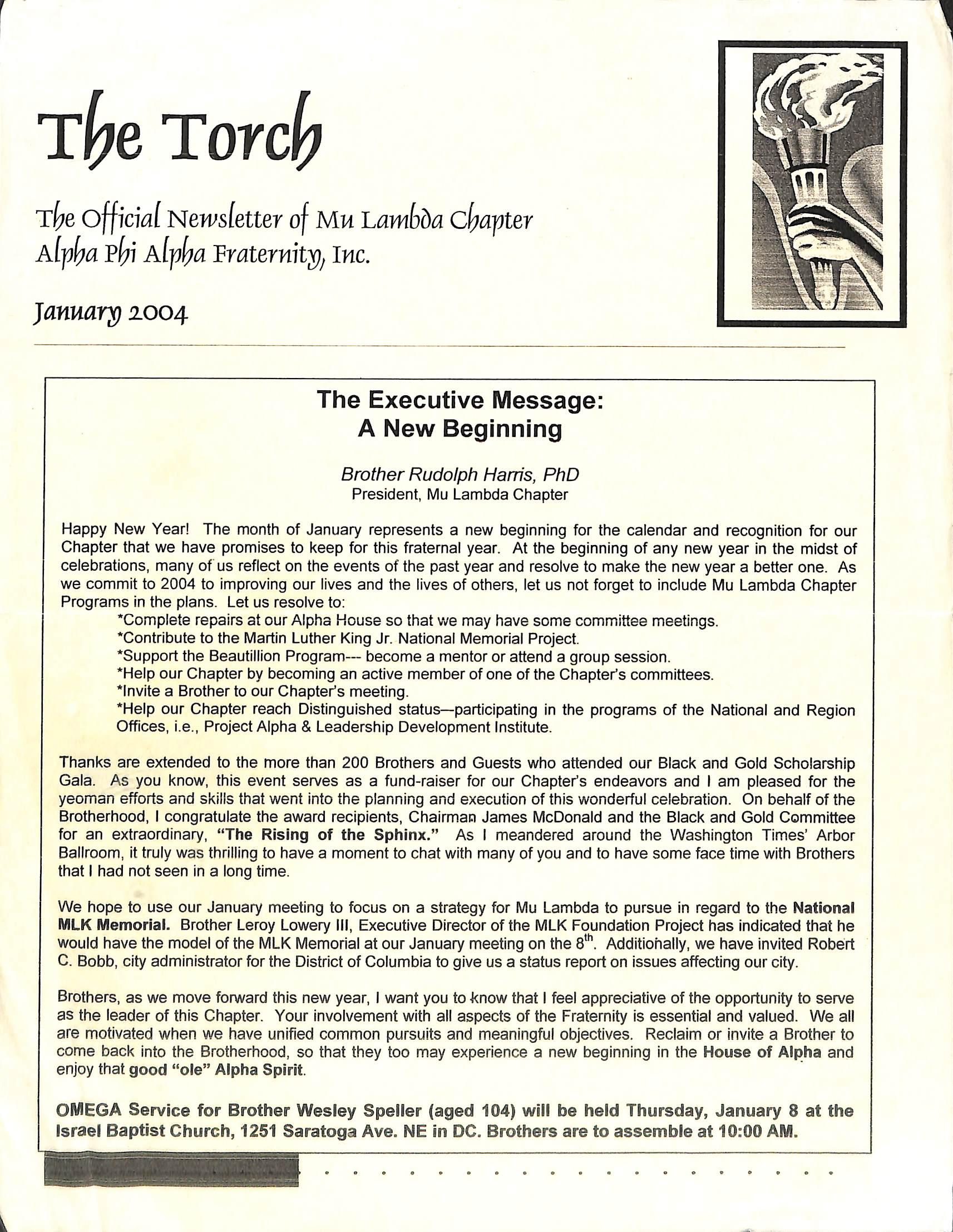 Happy New Year! The month of January represents anew beginning for the calendar and recognition for our Chapter that we have promises to keep for this fraternal year. At the beginning of any new year in the midst of celebrations, many of us reflect on the events of the past year and resolve to make the new year abetter one. As we commit to 2004 to Improving our lives and the lives of others, let us not forget to include Mu Lambda Chapter Programs in the plans. Let us resolve to: