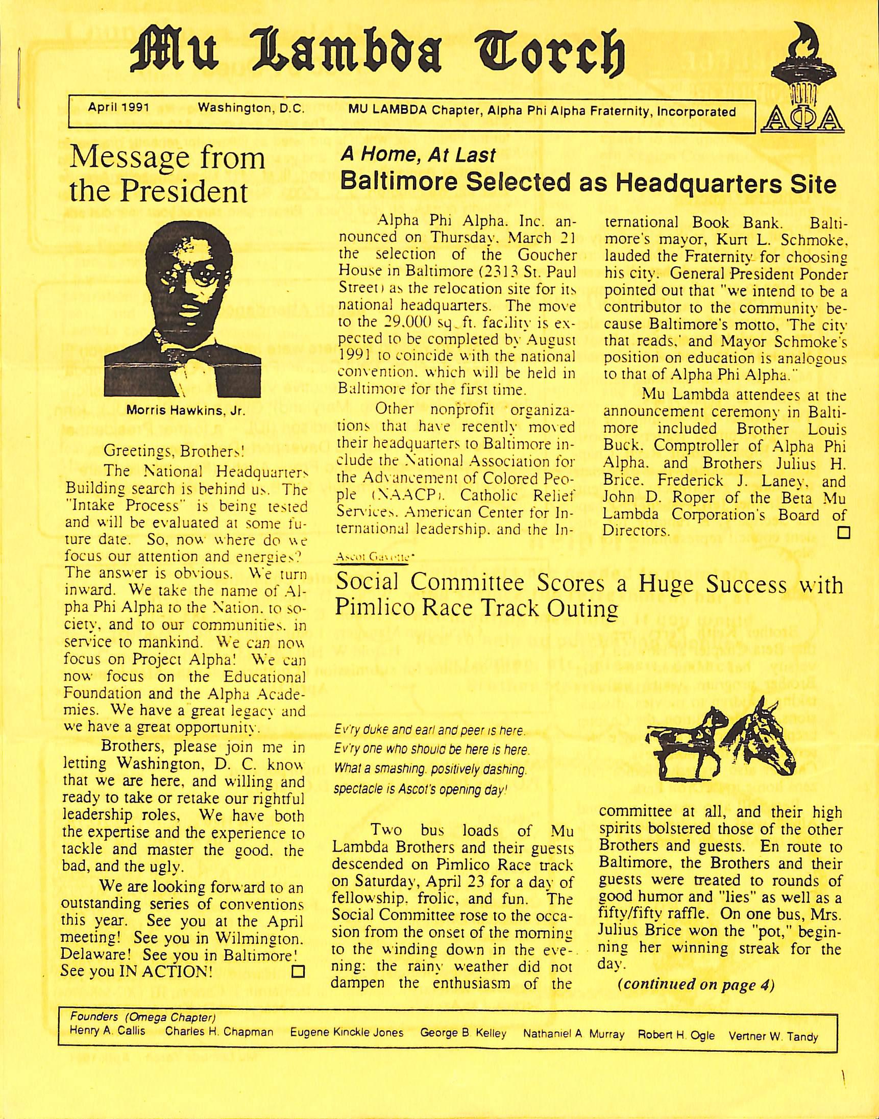 Alpha Phi Alpha. Inc. nounced on Thursday. March 21 the selection of the Goucher House in Baltimore (231.^ St. Paul Street) as the relocation site for its national headquarters. The move to the 29.000 sq. ft. facility is ex¬ pected to be completed b.v .August 1991 to coincide uiih the national comeniion. which uill be held in Baliimoie for the fi rst lime.