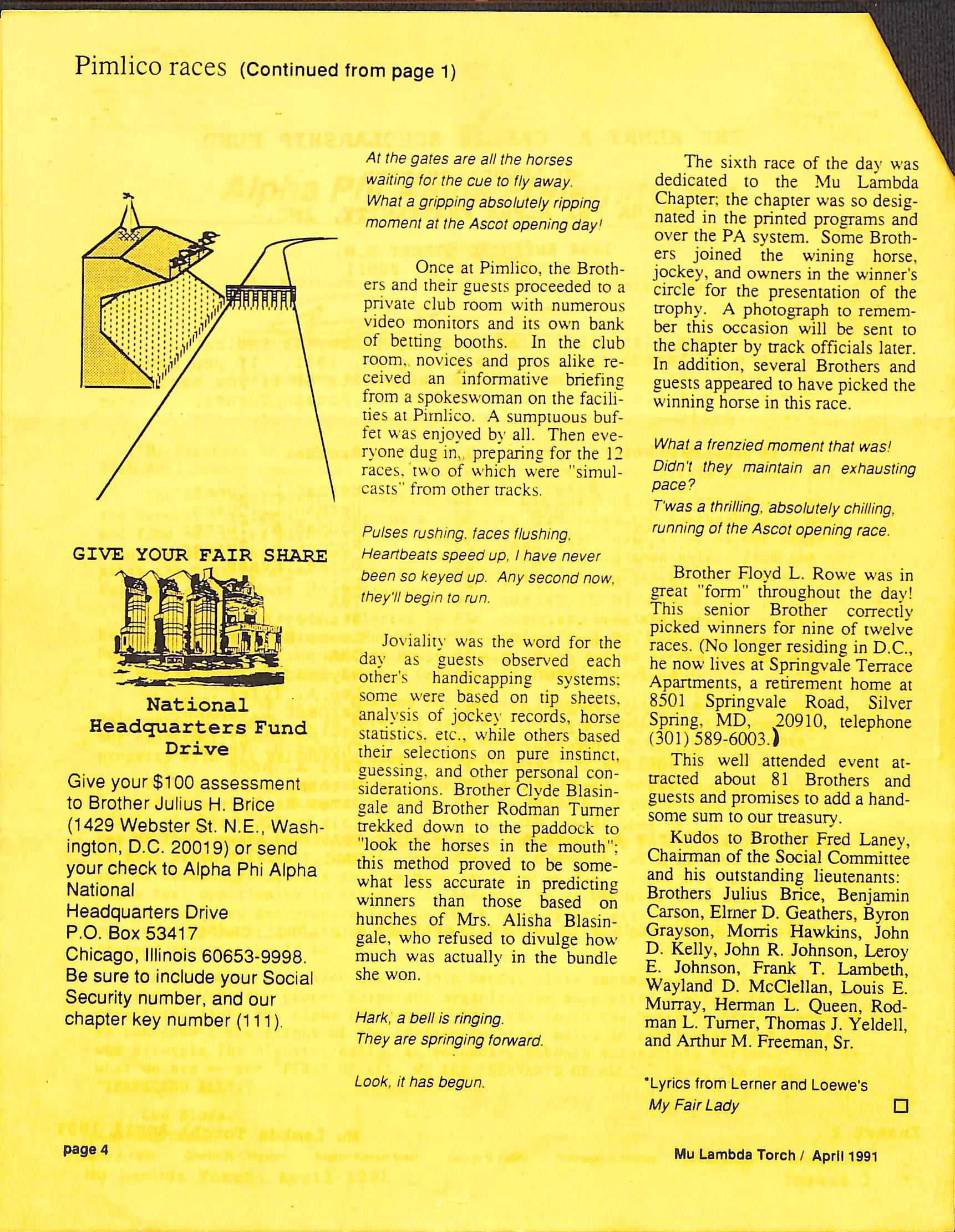 Two bus loads of .Mu Lambda Brothers and their guests descended on Pimlico Race track on Saturday, April 23 for aday of fellowship, frolic, and fun. The Social Committee rose to the occa¬ sion from the onset of the morning to the winding down in the eve¬ ning: the rainy weather did not dampen the enthusiasm of the □