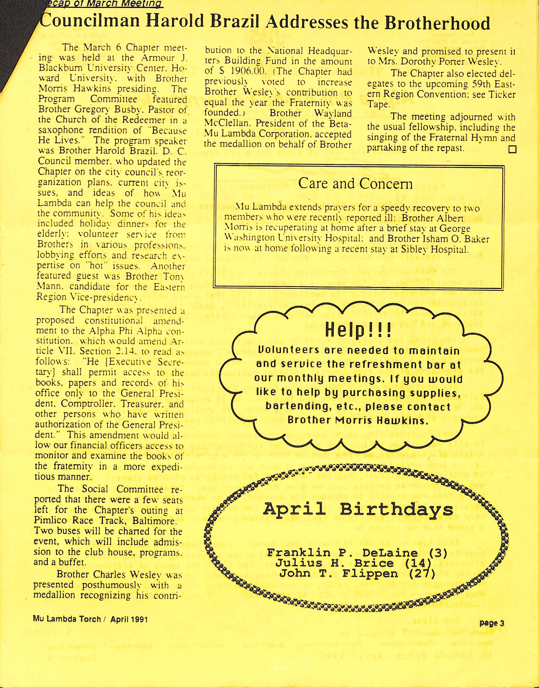 The March 6Chapter meeiing v-'as held ai the Armour J. Blackburn University Center. HoW ward Universii>. with Brother f Morris Hawkins presiding. The Program Committee featured Brother Gregory Busby. Pastor of the Church of the Redeemer in a saxophone rendition of "Because He Lives." The program speaker was Brother Harold Brazil. D. C, Council member, uho updated the Chapter on the cii\ council sreor¬ ganization plans, current cit\ is¬ sues. and ideas of hou ’.Mu Lambda can help the council and the communii)-. Some of his idea^ included holida\- dinners for the elderly: volunteer ser\ice from Brothers in \arious professions, lobbying effons and research ex¬ pertise on "hot" issues. Another featured guest v.as Brother Ton> .Mann, candidate for the Eastern Region \'ice-presidenc>.