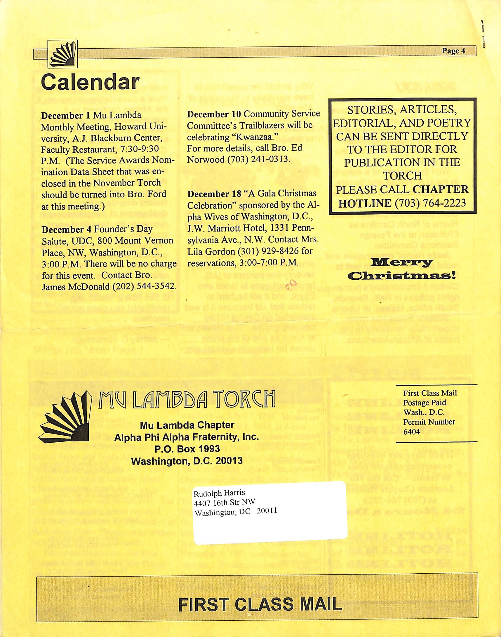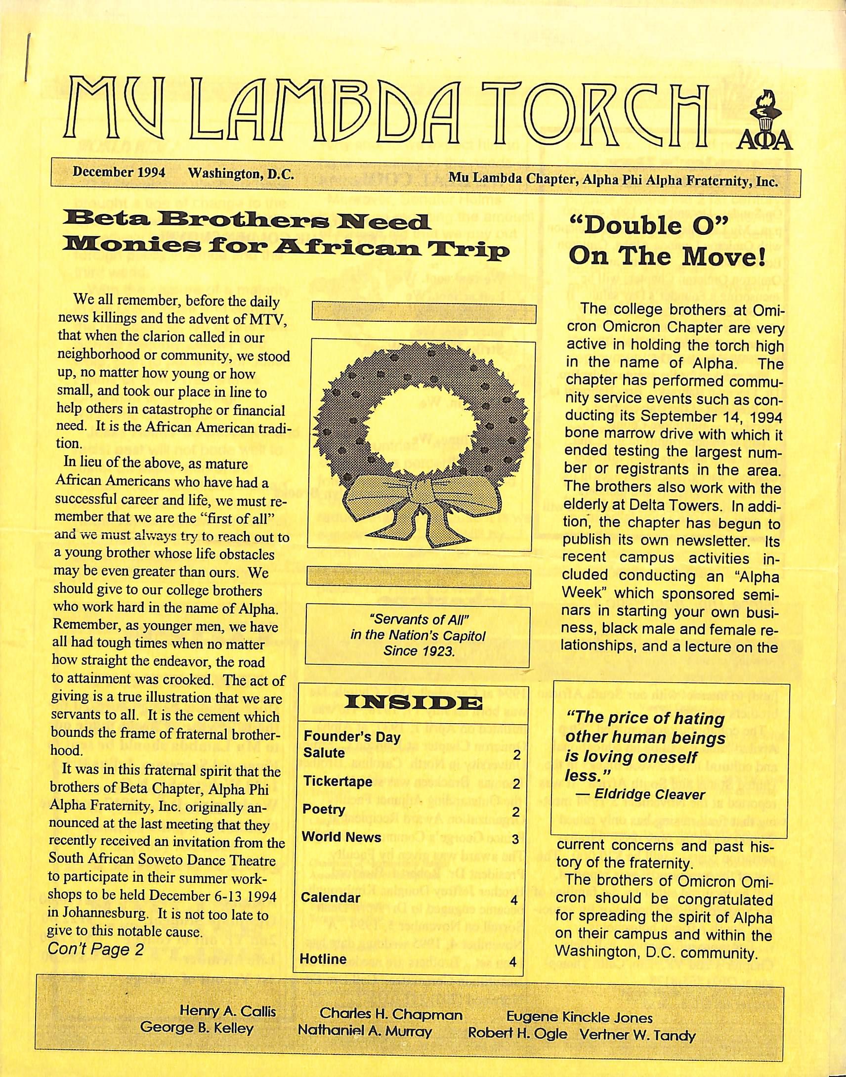 On Sunday, December 4, 1994, at 3:00 p.m., Mu Lambda Chapter in conjunction with Omicron Lambda Alpha, Omicron Eta Lambda, Beta, Nu Beta, and Omicron Omicron Chapters will be sponsoring aFounder’s Day salute. It will be held at the Carnegie Library, University of the District of Columbia,800 Mount Vernon Place, N.W. Washington, D.C.
