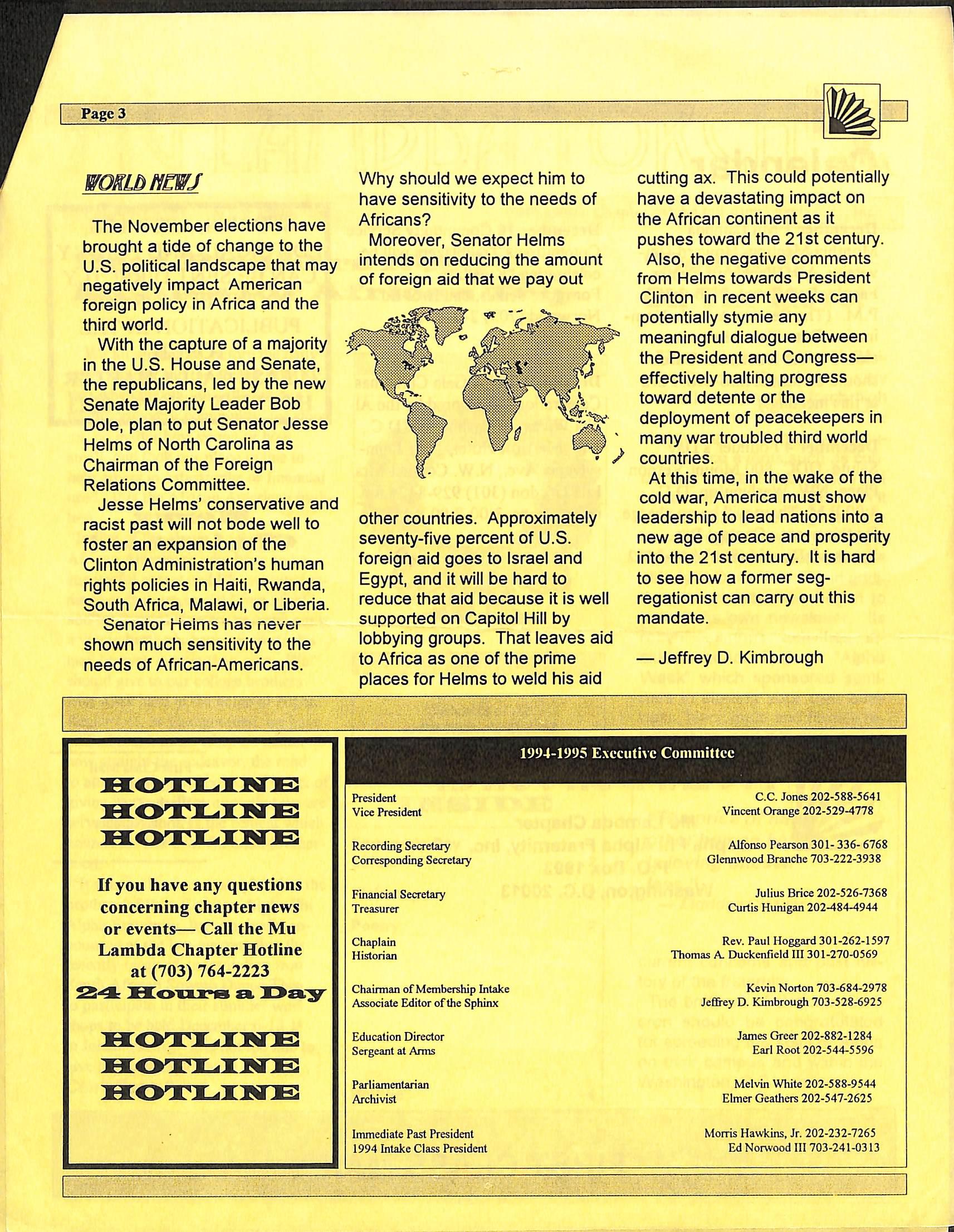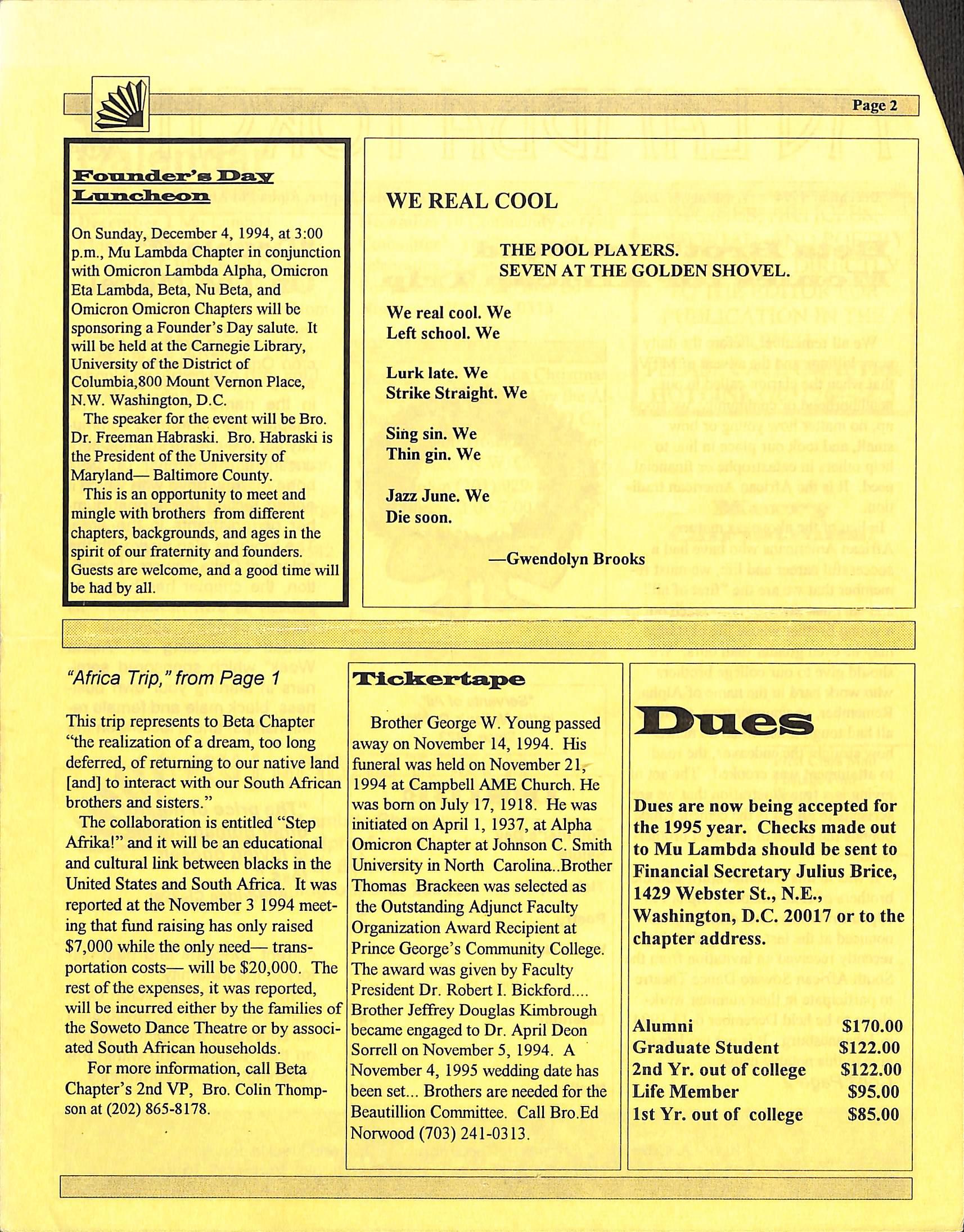 Brother George W. Young passed away on November 14, 1994. His funeral was held on November 21, 1994 at Campbell AME Church. He was bom on July 17, 1918. He was initiated on April 1, 1937, at Alpha Omicron Chapter at Johnson C. Smith University in North Carolina..Brother Thomas Brackeen was selected as the Outstanding Adjunct Faculty Organization Award Recipient at Prince George’s Community College. The award was given by Faculty President Dr. Robert I. Bickford.... Brother Jeffrey Douglas Kimbrough became engaged to Dr. April Deon Sorrell on November 5, 1994. A November 4, 1995 wedding date has been set... Brothers are needed for the Beautillion Committee. Call Bro.Ed Norwood (703) 241-0313.
