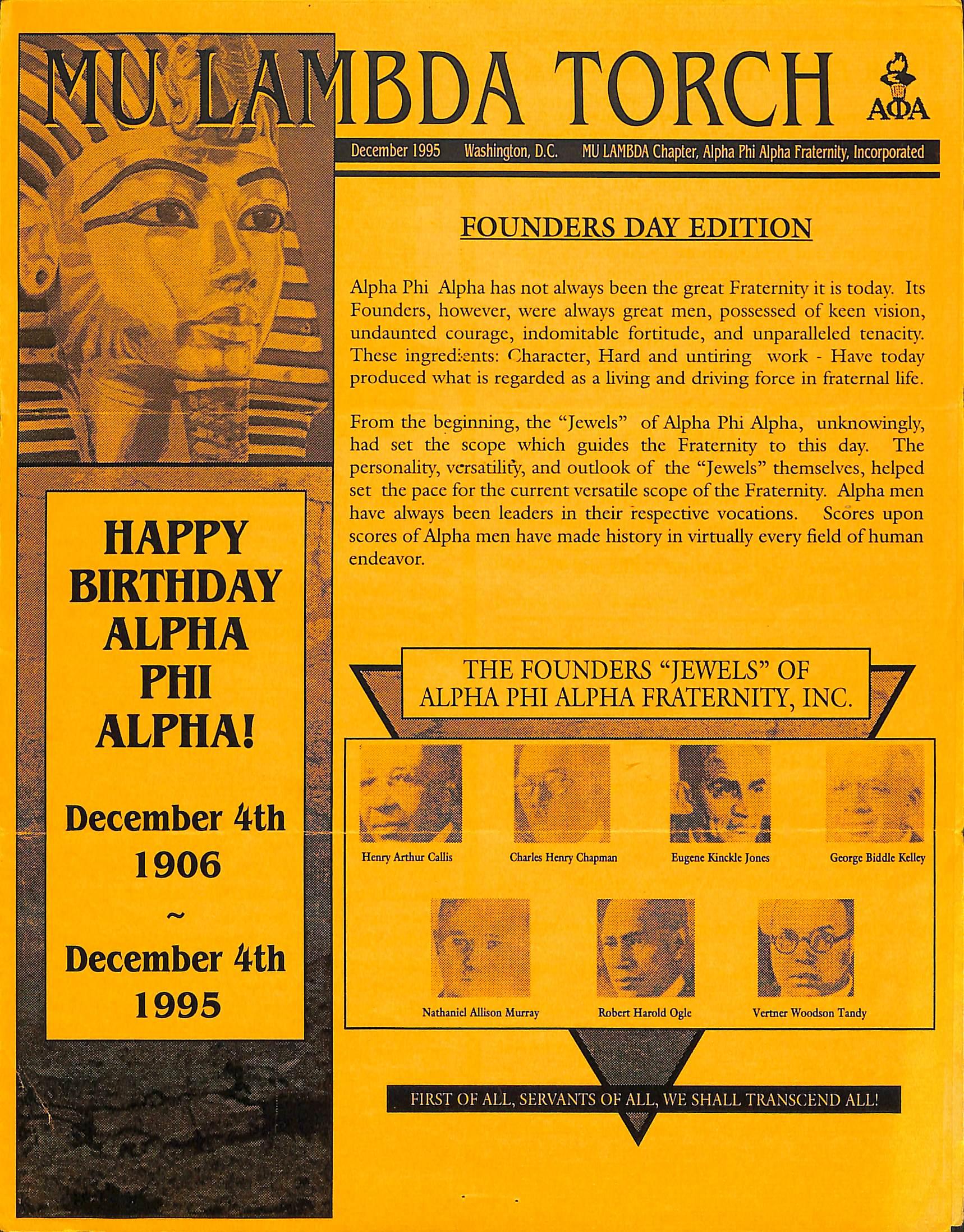 'It is fitting in this edition of the Torch that we pause amoment to reflect on the deeds of the late Brother C. C. House, who entered the Omega Chapter one year ago on December 2, 1994, two days before the anniversary date of the Fraternity. Brother House powerfual force in Mu Lambda, the Eastern Region and the National Organization. He was committed, loyal and omnipresent in Alpha, and was invaluable mentor to countless Alpha men.