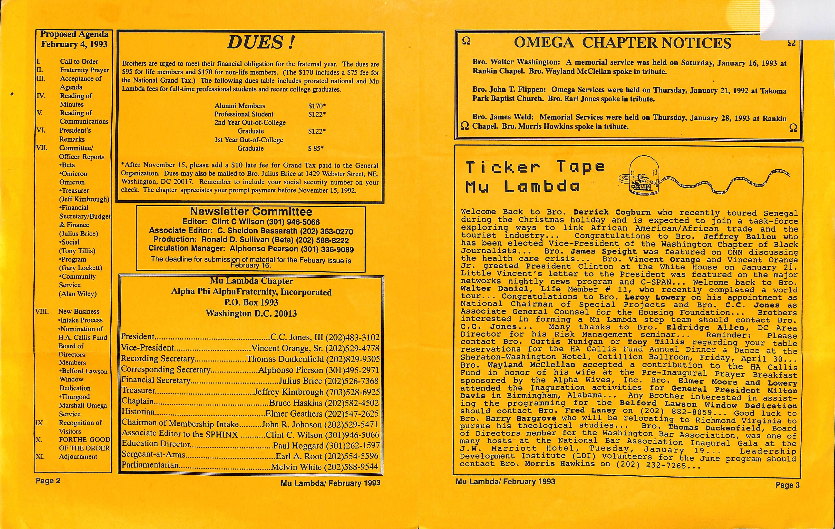 Welcome Back to Bro. Derrick Cogburn who recently toured Senegal during the Christmas holiday and is expected to join atask-force exploring ways to link African American/African trade and the tourist industry... Congratulations to Bro. Jeffrey Ballou who has been elected Vice-President of the Washington Chapter of Black Journalists... Bro. James Speight was featured on CNN discussing the health care crisis... Bro. Vincent Orange and Vincent Orange Jr. greeted President Clinton at the White House on January 21. Little Vincent's letter to the President was featured on the major networks nightly news program and C-SPAN... Welcome back to Bro. Walter Daniel, Life Member #11, who recently completed aworld tour... Congratulations to Bro. Leroy Lowery on his appointment as National Chairman of Special Projects and Bro. C.C. Jones as Associate General Counsel for the Housing Foundation... Brothers interested in forming aMu Lambda step team should contact Bro. C.C. Jones...