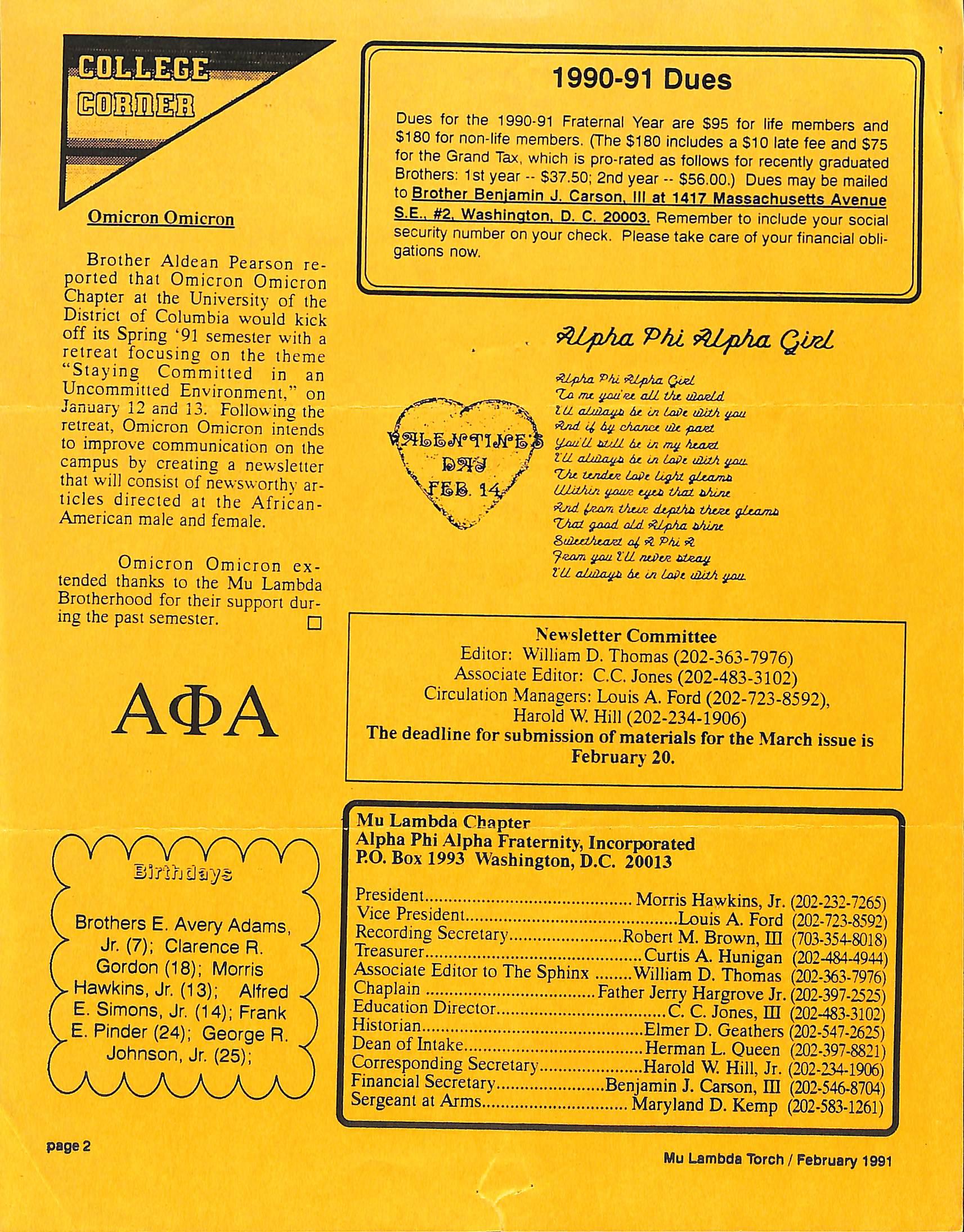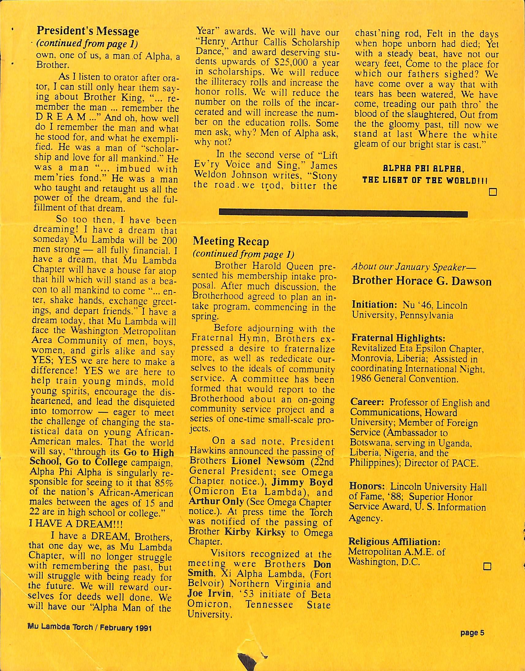 Mu Lambda held its fi rst meeting of 1991 at the Howard Inn on January 3at 7:00 RM. with President Morris Hawkins. Jr. and Vice-President Louis Ford presiding. Given ‘the crises in the Middle East, Liberia, and South Africa, Mu Lambda was fortunate to have one of its own. Brother Horace G. Dawson, Jr.