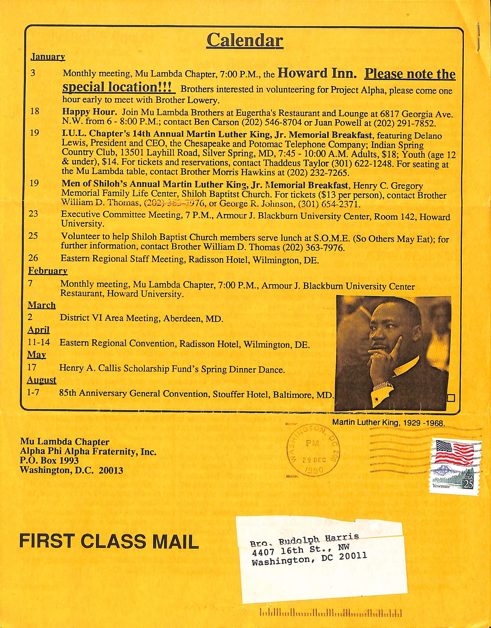 I.U.L. Chapter's 14th Annual Martin Luther King, Jr. Memorial Breakfast, featuring DelanoLewis,PresidentandCEO,theChesapeakeandPotomacTelephoneCompany;IndianSpring CountryClub,13501LayhillRoad,SilverSpring,MD,7:45-10:00A.M.Adults,$18;Youth(age12 &under), $14. For tickets and reservations, contactThaddeusTaylor (301) 622-1248. For seating the Mu Lambda table, contact Brother Morris Hawkins at (202) 232-7265.