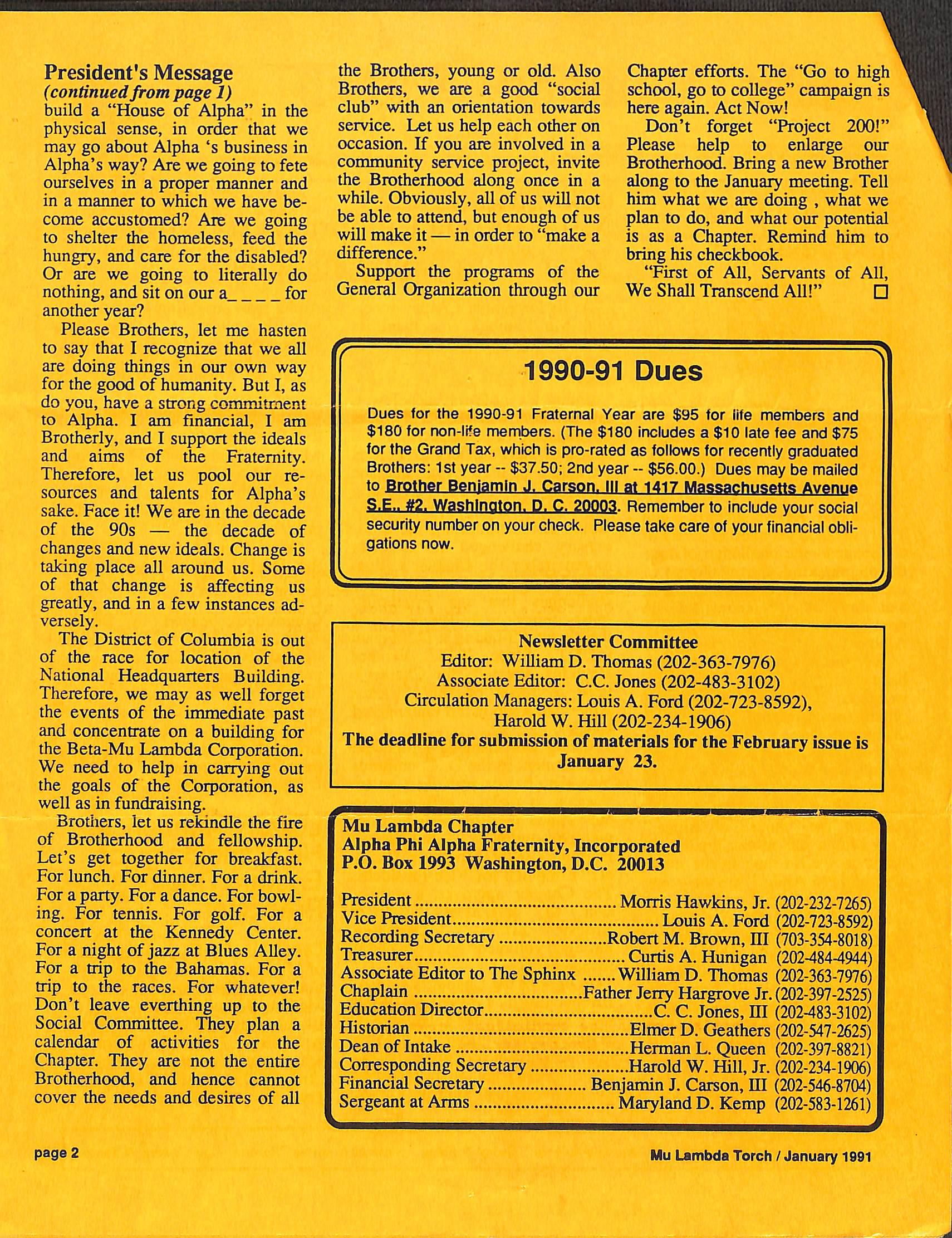 Dues for the 1990-91 Fraternal Year are $95 for life members and $180 for non-life members. {The $180 includes a$10 late fee and $75 for the Grand Tax, which is pro-rated as follows for recently graduated Brothers: 1st year -$37.50; 2nd year -$56.00.) Dues may be mailed to Brother Beniamin J. Carson. Ill at 1417 Massachusetts Avenue #2. Washington. D. C. 20003. Remember to include your social security number on your check. Please take care of your financial obli¬ gations now. the decade of