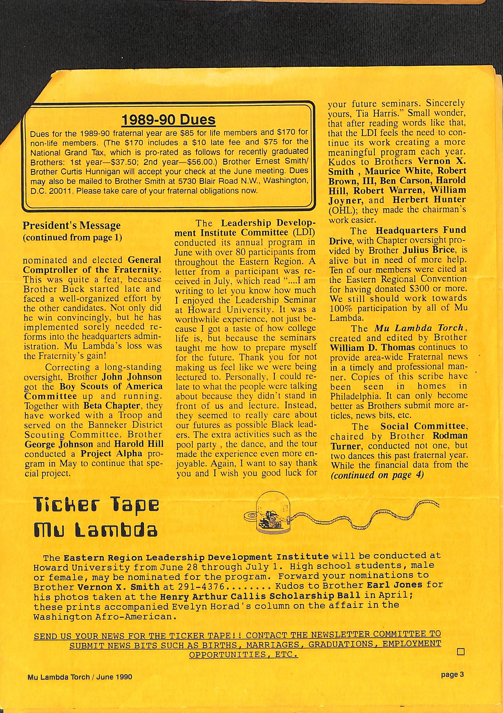 Dues tor the 1989-90 fraternal year are $85 for life members and $170 for non-life members. (The $170 includes a$10 late fee and $75 for the National Grand Tax, which is pro-rated as follows for recently graduated Brothers: 1st year—$37.50; 2nd year—$56.00.) Brother Ernest Smith/ Brother Curtis Hunnigan will accept your check at the June meeting. Dues may also be mailed to Brother Smith at 5730 Blair Road N.W., Washington, D.C. 20011. Please take care of your fraternal obligations now.
