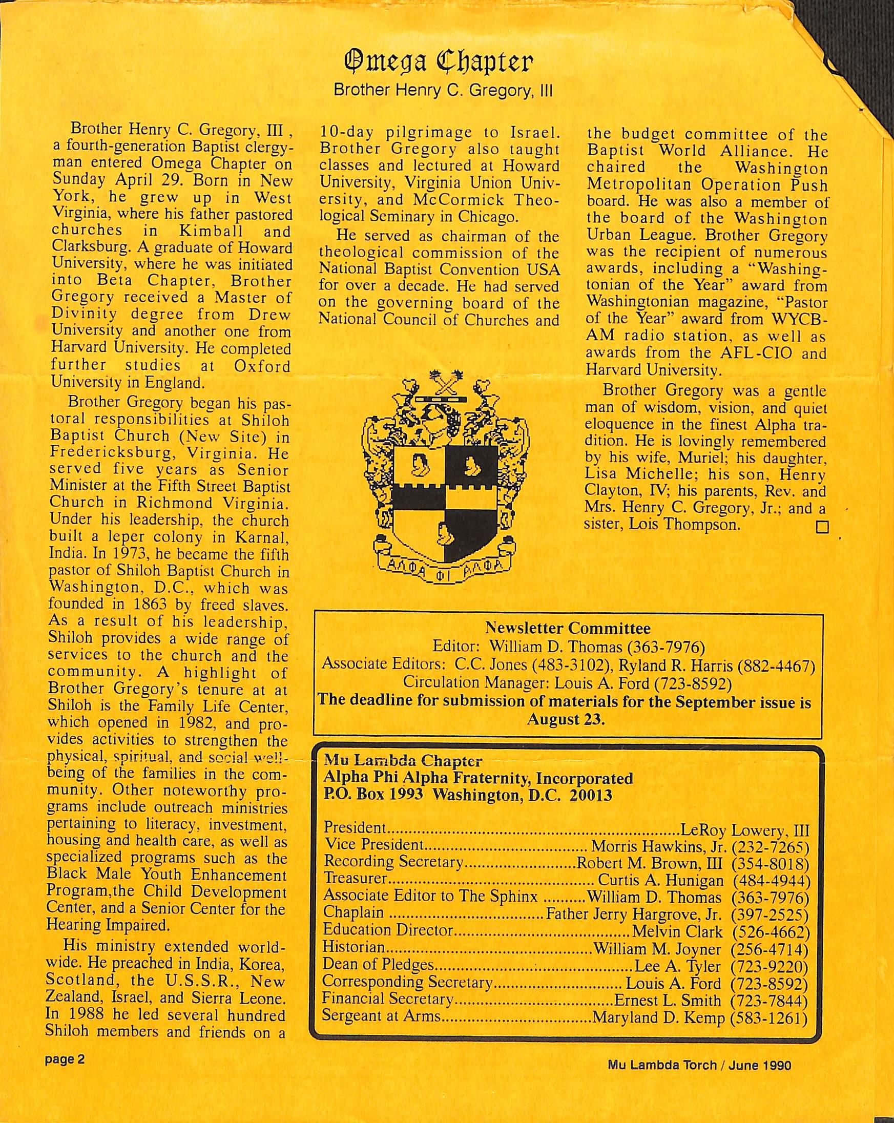 Brother Gregory was agentle man of wisdom, vision, and quiet eloquence in the finest Alpha tra¬ dition. He is lovingly remembered by his wife, Muriel; his daughter, Lisa Michelle; his son. Henry Clayton, IV; his parents, Rev. and Mrs. Henry C. Gregory, Jr.; and a sister, Lois Thompson.