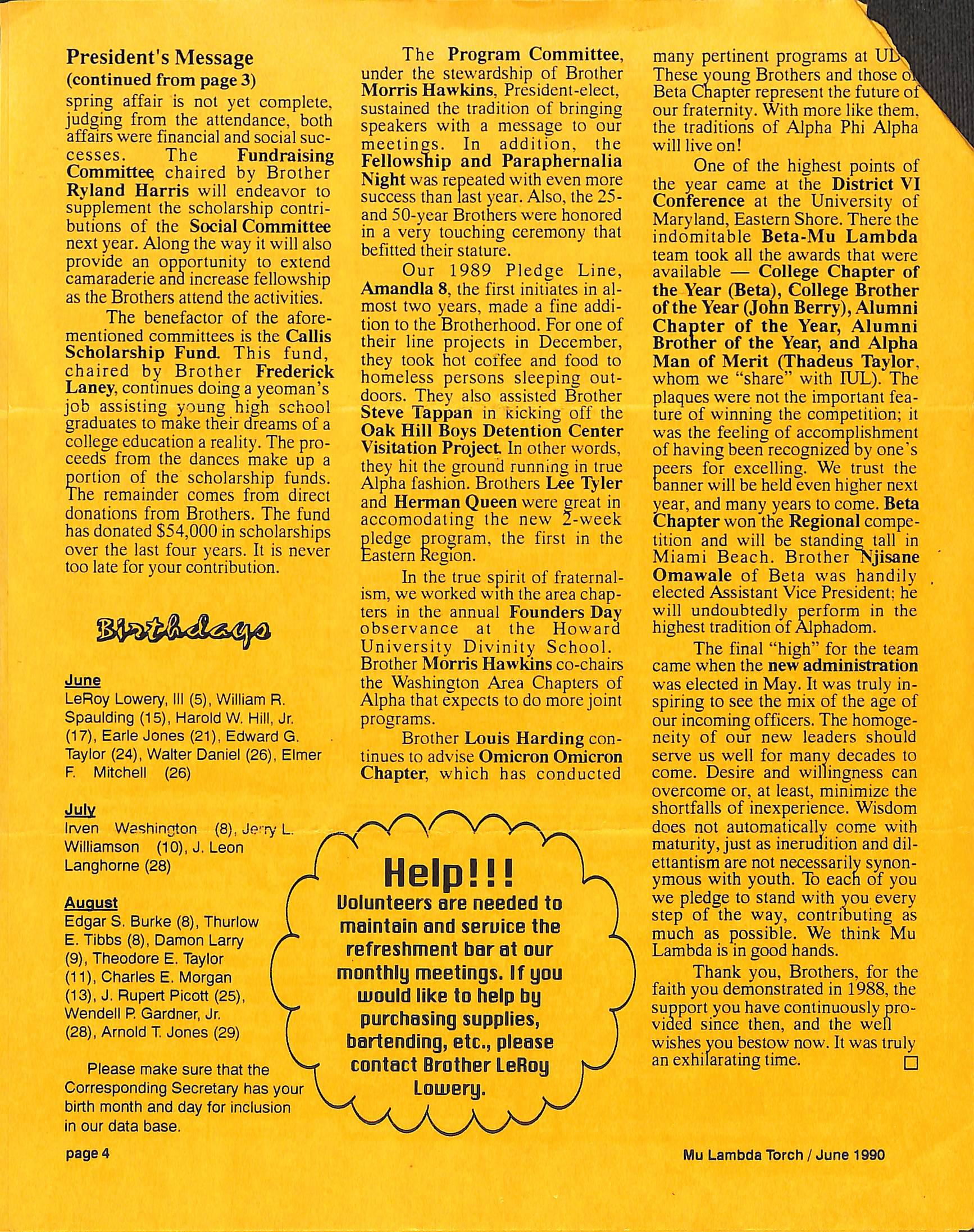 In the June 1989 issue of this newsletter (then the Alpha Newsletter) Igave an assessment of of the “State of the Chapter”. Since then, agreat deal of water has flowed over the “dam,” so an update is in order. Building on the momentum that was generated in the past, Mu Lambda Brothers de¬ scended on San Antonio, Texas in July of 1989 for the 83rd Anniversary Convention. Putting its collective energies together, led by Brothers Julius Brice and Thomas Brackeen, our then-vice President, Louis W. Buck, was (continued on page 3)