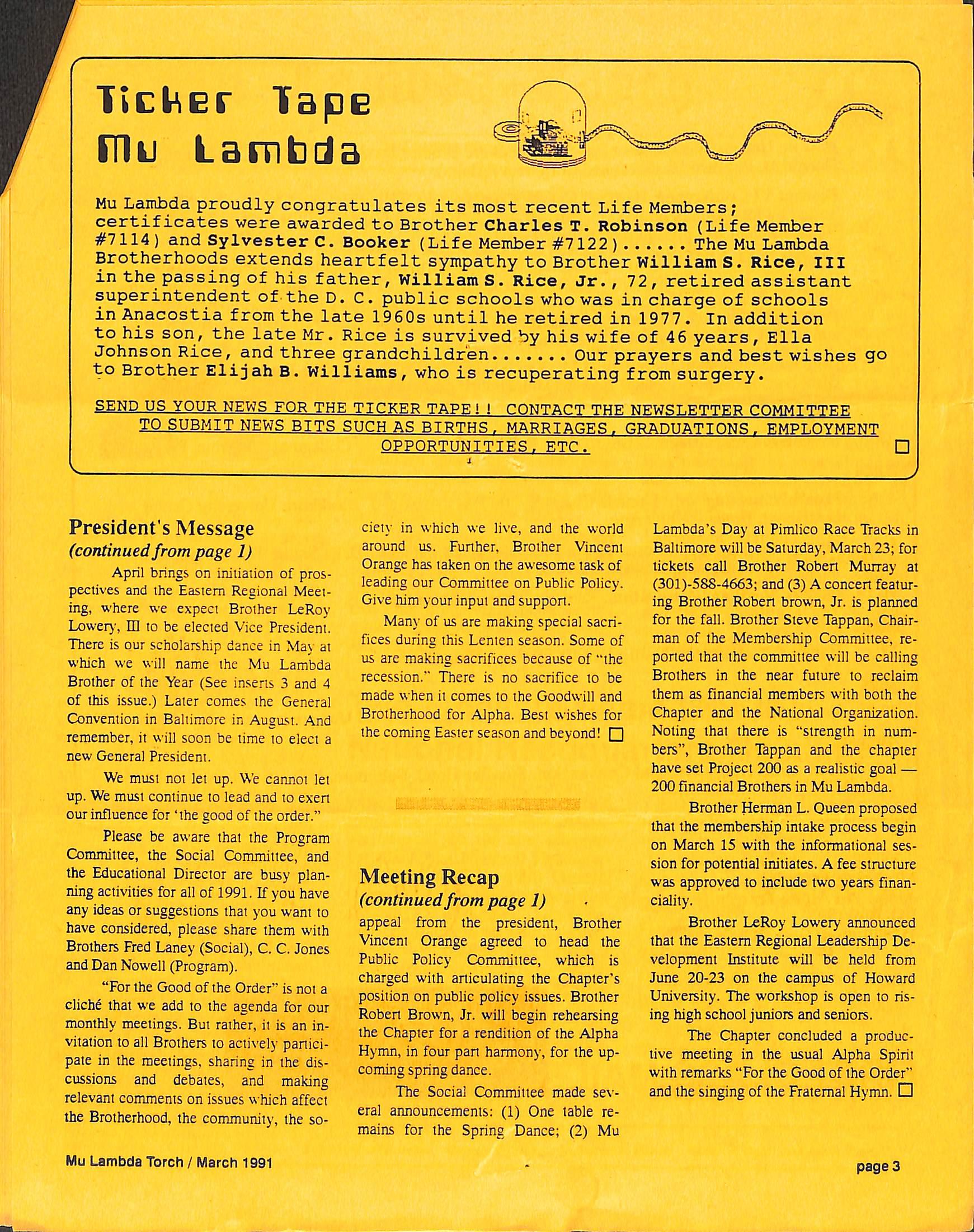 Mu Lambda proudly congratulates its most recent Life Members; certificates were awarded to Brother Charles T. Robinson (Life Member #7114) and SylvesterC. Booker (Life Member #7122 ) Brotherhoods extends heartfelt sympathy to Brother William S. Rice, III in the passing of his father, William S, Rice, Jr. ,72 ,retired assistant superintendent of the D. C. public schools who was in charge of schools in Anacostia from the late 1960s until he retired in 1977. to his son, the late Mr. Rice is survived by his wife of 46 years, Ella Johnson Rice, and three grandchildren Our prayers and best wishes go to Brother Elijah B, Williams, who is recuperating from surgery.