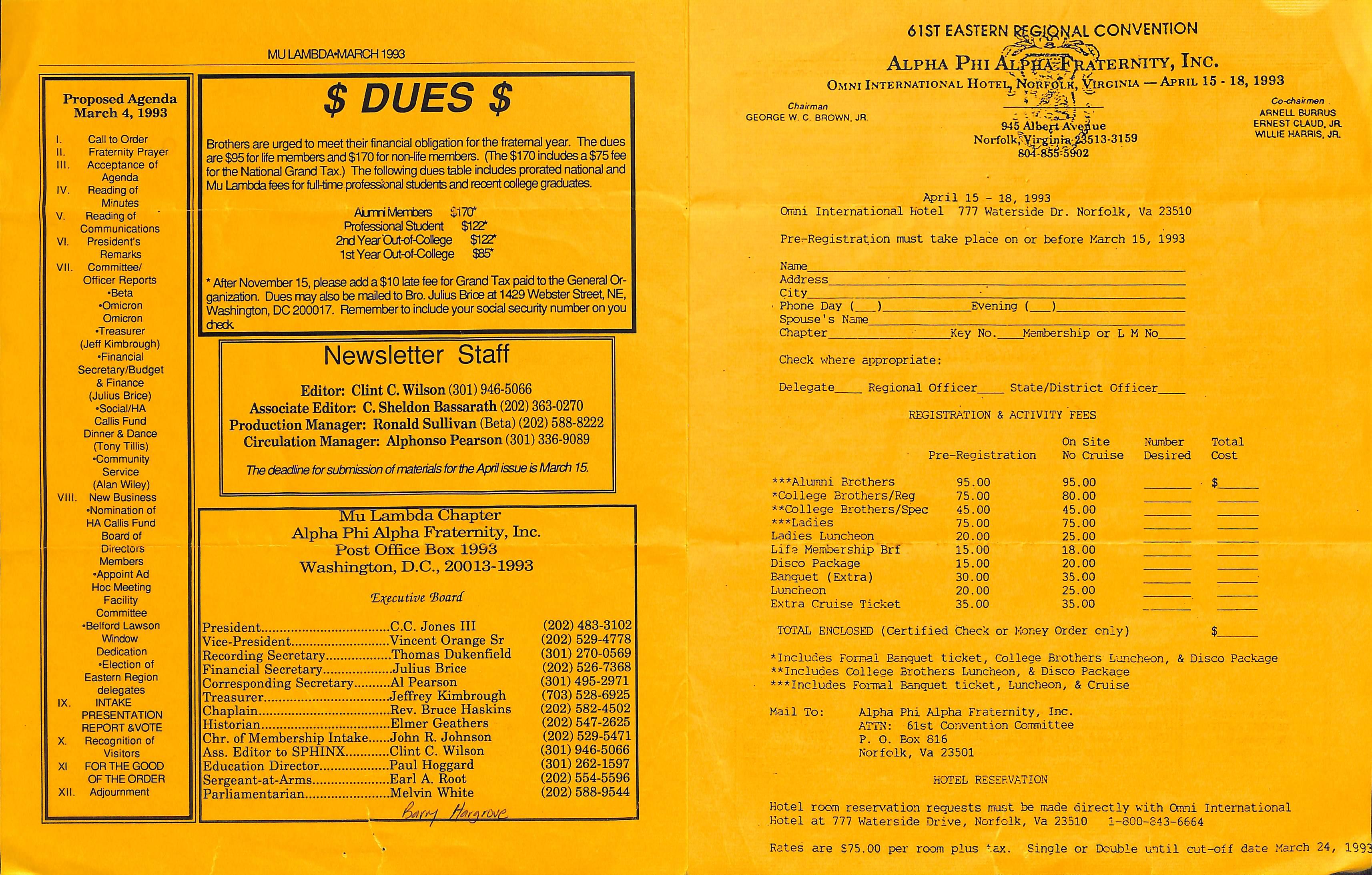 The March monthly meeting will culminate in the selection process for the 1993 Mu Lambda Intake Class. On Thursday, February 11 at the Rayburn House Office Building, Bro. John RJohnson, Chairman of Membership Intake, and Bro. C. C. Jones, Mu Lambda President, conducted an informational meeting for prospective intake candidates and sponsors.