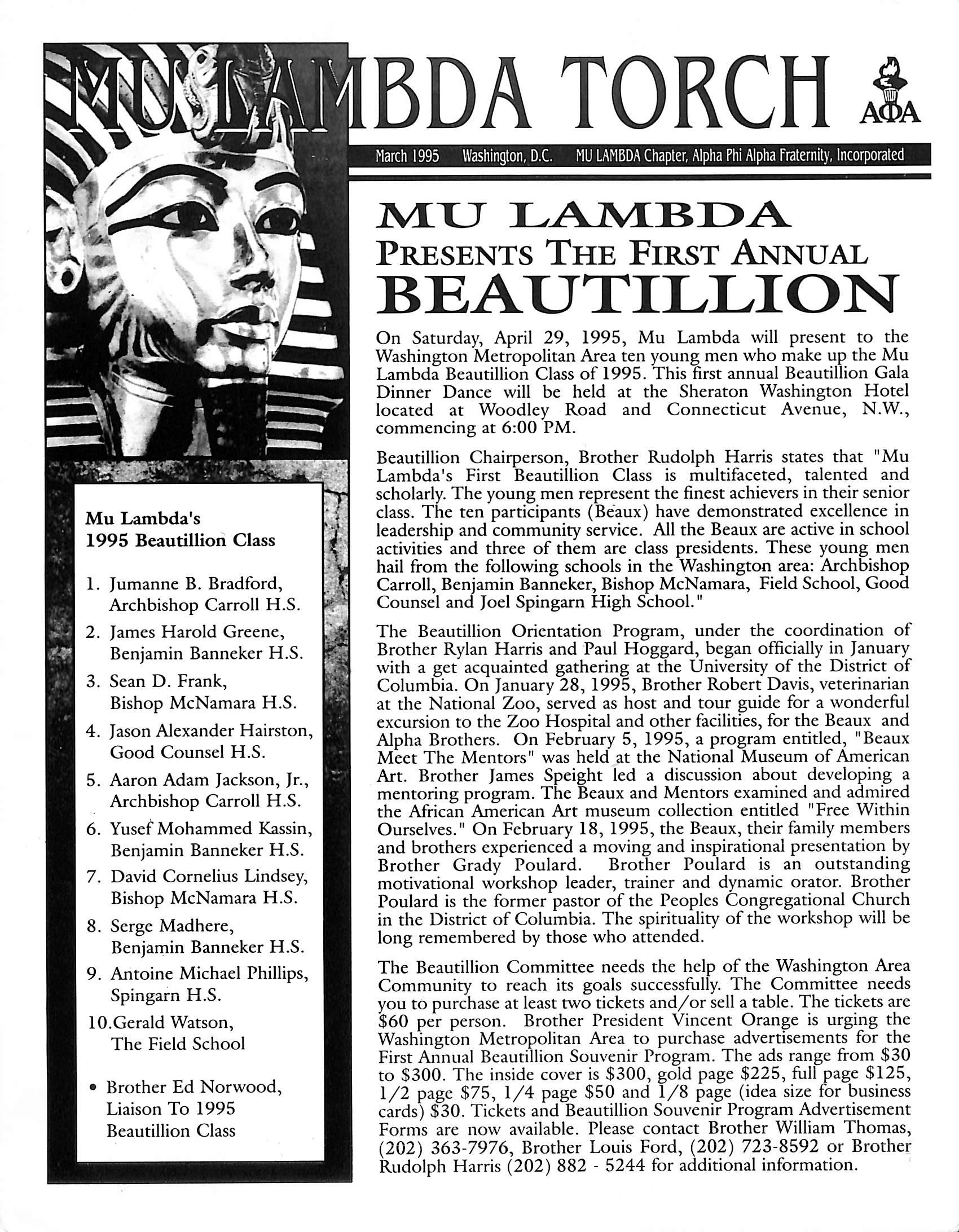 On Saturday, April 29, 1995, Mu Lambda will present to the Washington Metropolitan Area ten young men who make up the Mu Lambda Bcautillion Class of 1995. This first annual Beautillion Gala Dinner Dance will be held