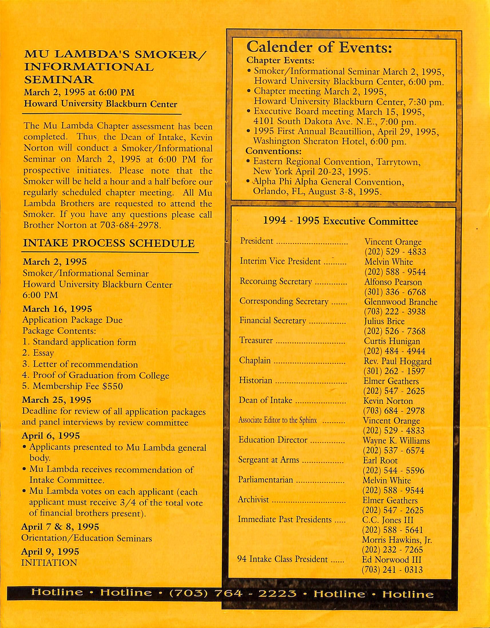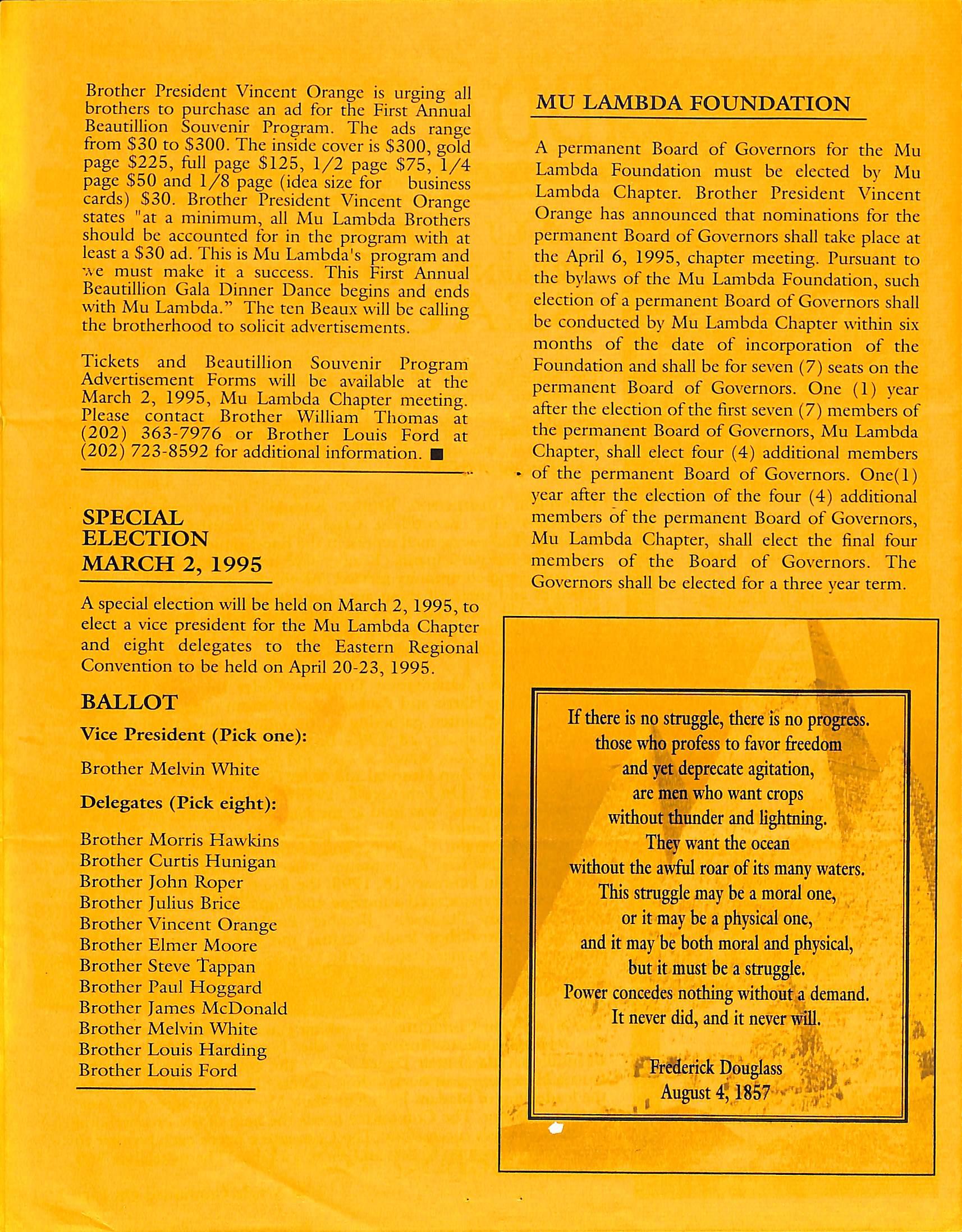 Brother President Vincent Orange is urging all brothers to purchase an ad for the First Annual Beautillion Souvenir Program. The ads range from S30 to S300. The inside cover is S300, gold page S225, fijll page S125, 1/2 page S75, 1/4 page $50 and 1/8 page (idea size for business cards) $30. Brother President Vincent Orange states "at aminimum, all Mu Lambda Brothers should be accounted for in the program with at least a$30 ad. This is Mu Lambda's program and we must make it asuccess. This First Annual Beautillion Gala Dinner Dance begins and ends with Mu Lambda.” The ten Beaux will be calling the brotherhood to solicit advertisements.