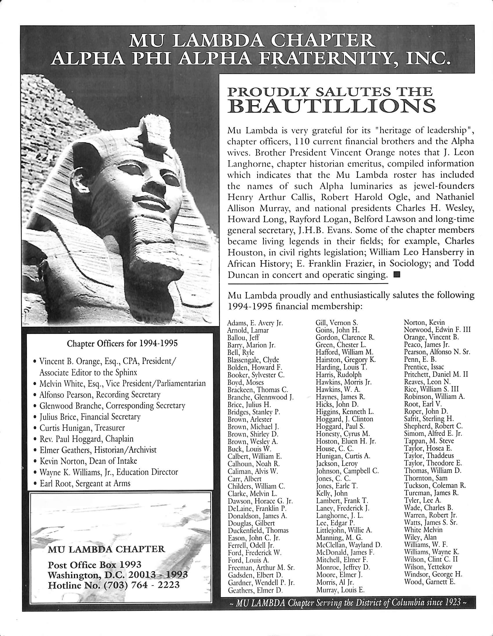 Mu Lambda is very grateful for its "heritage of leadership", chapter officers, 110 current financial brothers and the Alpha wives. Brother President Vincent Orange notes that J. Leon Langhorne, chapter historian emeritus, compiled information which indicates that the Mu Lambda roster has included the names of such Alpha luminaries as jewel-founders Henry Arthur Callis, Robert Harold Ogle, and Nathaniel Allison Murray, and national presidents Charles H. Wesley, Howard Long, Rayford Logan, Belford Lawson and long-time general secretary, J.H.B. Evans. Some of the chapter members became living legends in their fields; for example, Charles Houston, in civil rights legislation; William Leo Hansberry in African History; E. Franklin Frazier, in Sociology; and Todd Duncan in concert and operatic singing. ■