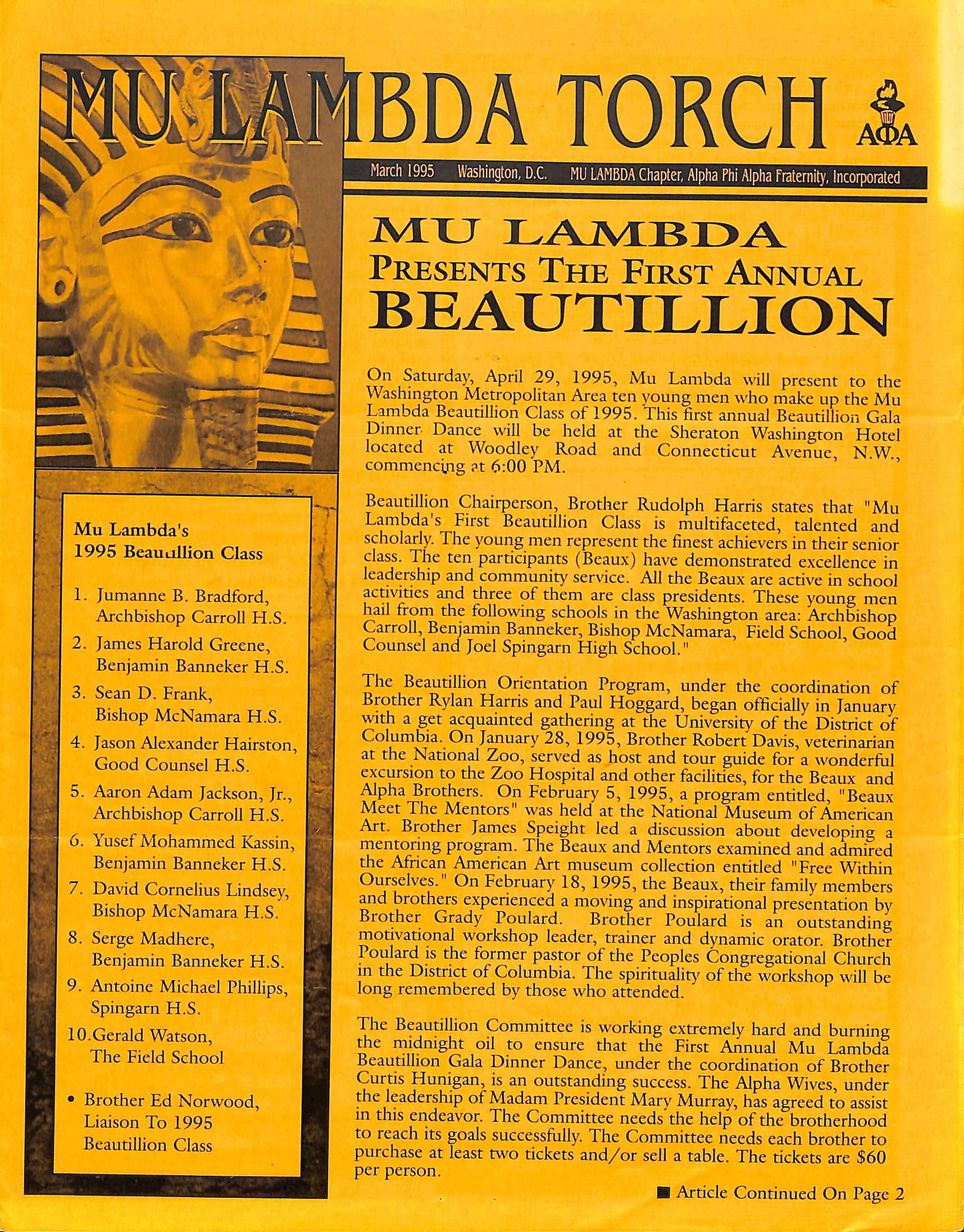 Beautillion Chairperson, Brother Rudolph Harris states that "Mu Lambda's First Beautillion Class is multifaceted, talented and scholarly. The young men represent the finest achievers in their senior class. The ten participants (Beaux) have demonstrated excellence in leadership and community service. All the Beaux are active in school activities and three of them are class presidents. These young men hailfromthefollowingschoolsintheWashingtonarea:Archbishop Carroll, Benjamin Banneker, Bishop McNamara, Field School, Good Counsel and Joel Spingarn High School."