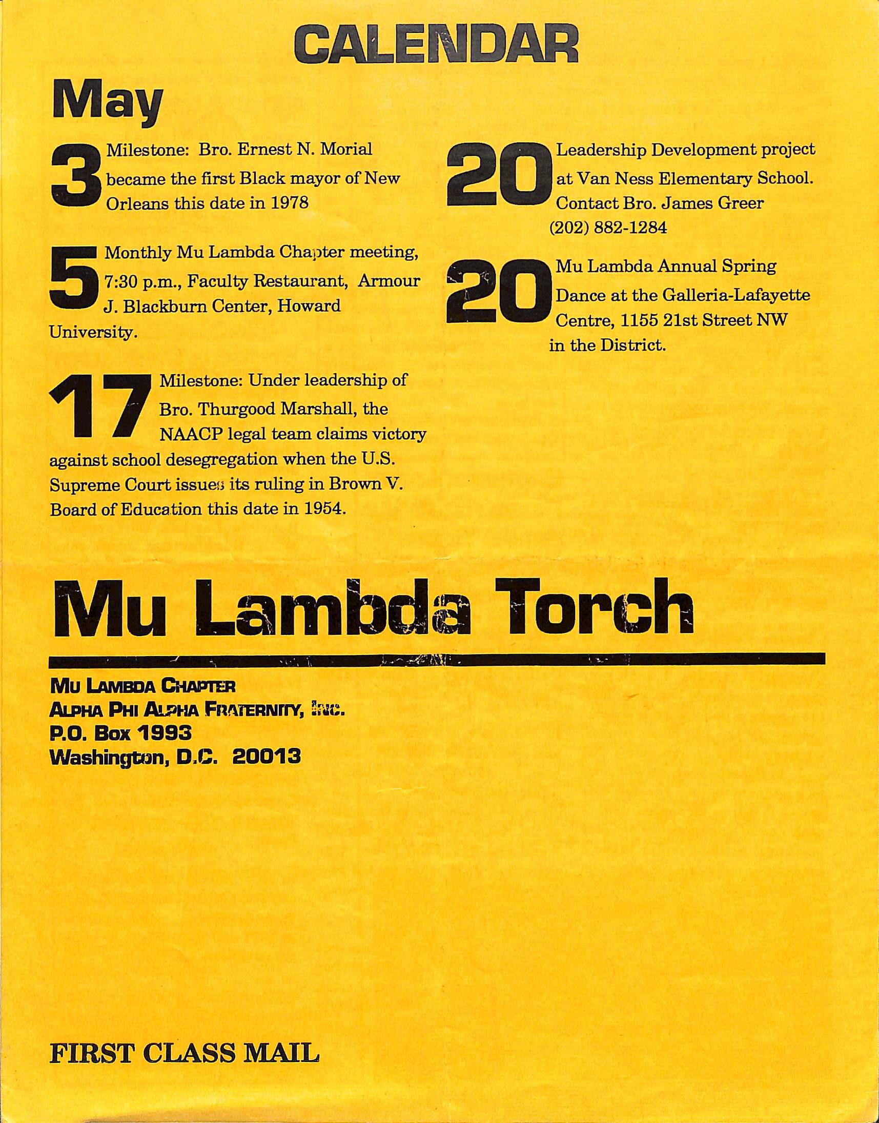 Brothers of Mu Lambda, their ladies and guests are eagerly looking for¬ ward to the chapter sonnunl Spring Dance on Friday, May 20 at the Galleria-Lafayette Centre, 1155 21st Street NW, in the District.