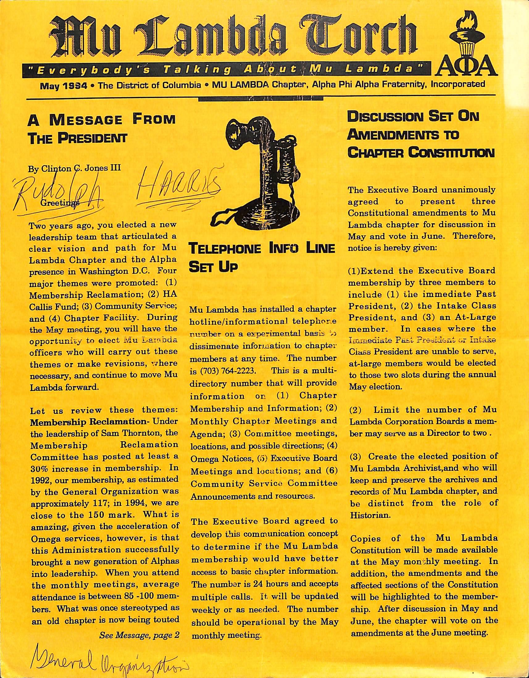 Most recently, the chapter has installed aChapter Hotline tele¬ phone number- (703) 764-2223. [See related story.] These efforts are made in response to your comments and suggestions that TTifllcA membership in Mu Lambda easier and convenient. Bro. Lance Thompson will revitalize our monthly Happy Hours, and we will look forward to aSocial Committee that will program activities for our mutual benefit and pleasure.