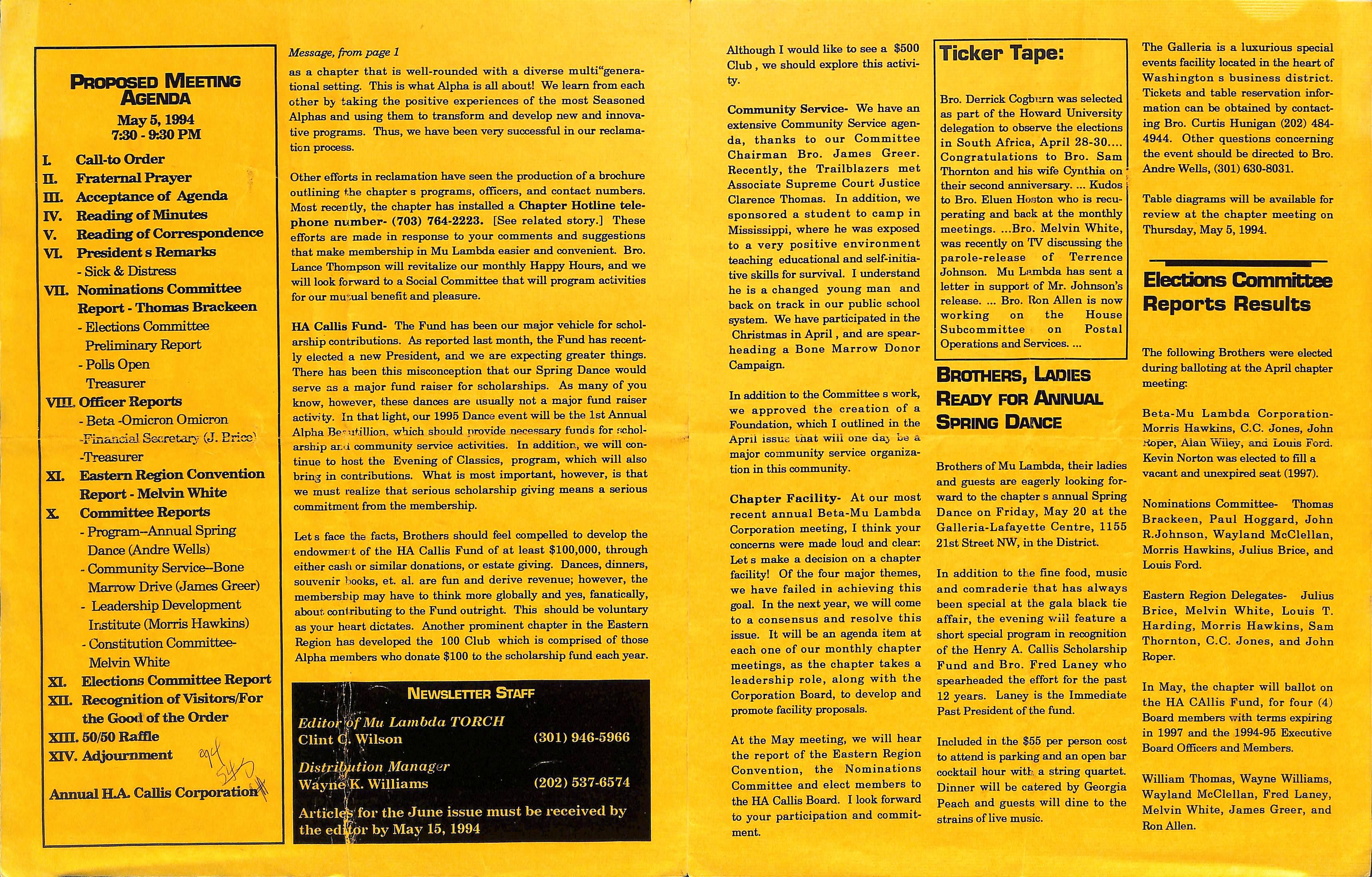 Table diagrams will be available for review at the chapter meeting on Thursday, May 5, 1994. perating and back at the monthly meetings. ...Bro. Melvin White, was recently on 'IV discussing the parole-release of Terrence Johnson. Mu Liunbda has sent a letter in support of Mr. Johnson’s release. ... Bro. Ron Allen is now House Postal Elections Committee Reports Results the working Subcommittee Operations and Services.... on