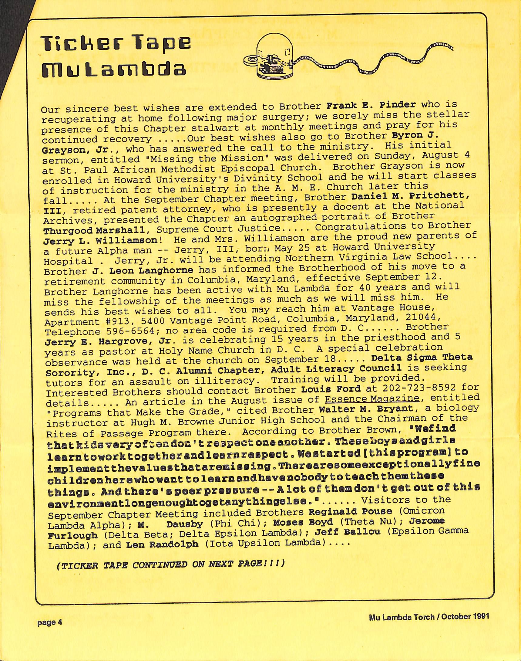 Our sincere best wishes are extended to Brother Frank E recuperating at home following major surgery; we sorely miss the stellar presence of this Chapter stalwart at monthly meetings and pray for his continued recovery Our best wishes also go to Brother Byron J. Grayson, Jr., who has answered the call to the ministry. His initial sermon, entitled “Missing the Mission" was delivered on Sunday, August 4 at St. Paul African Methodist Episcopal Church. Brother Grayson is now enrolled in Howard University's Divinity School and he will start classes of instruction for the ministry in the A. M. E. Church later this