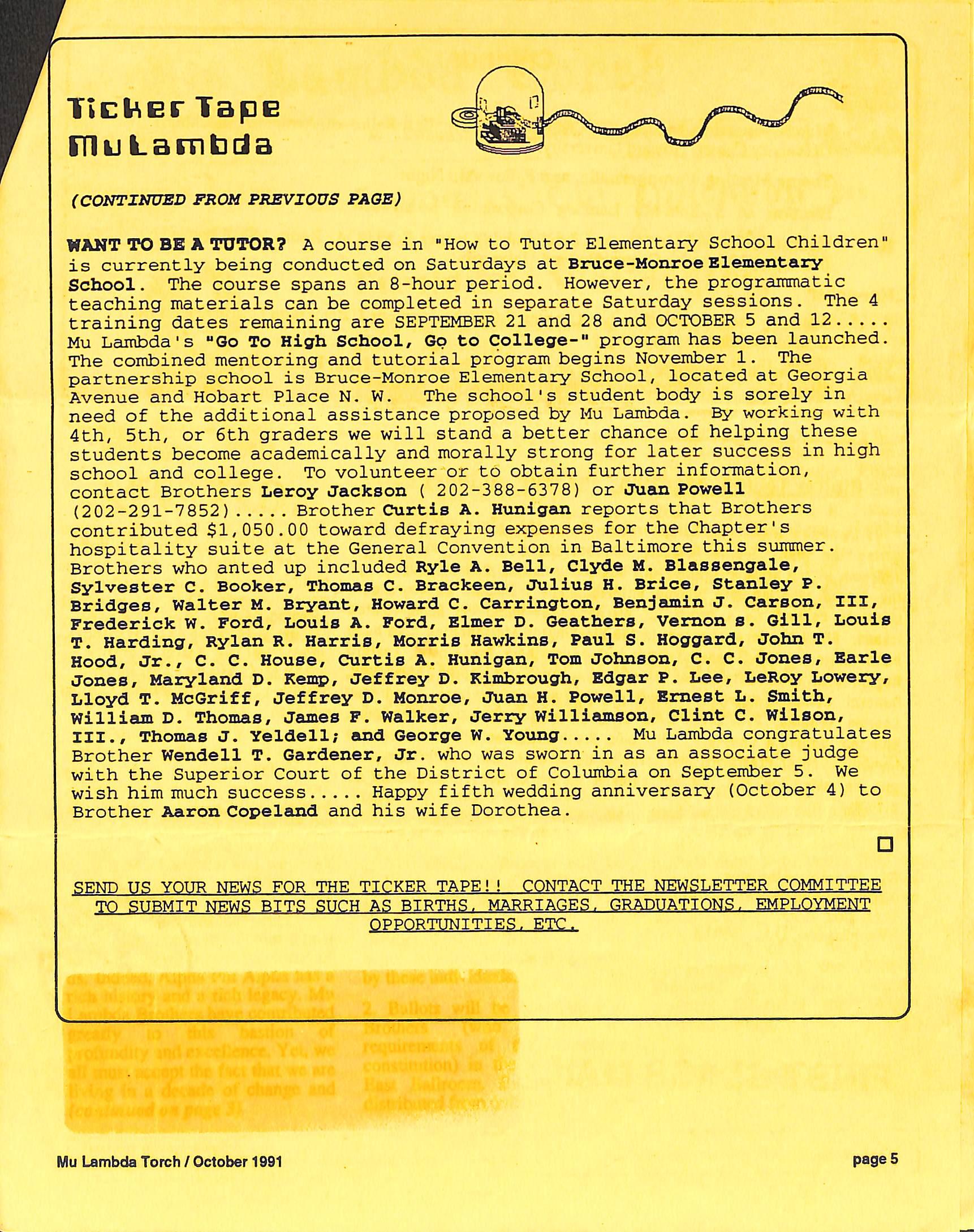 At the September Chapter meeting. Brother Daniel M. Pritcnett, III retired patent attorney, who is presently adocent at the National Archives, presented the Chapter an autographed portrait of Brother Thurgood Marshall, Supreme Court Justice Congratulations to Brother Jerry L. Williamson! He and Mrs. Williamson are the proud new parents ot afuture Alpha man —Jerry, III, born May 25 at Howard University Hospital .Jerry, Jr. will be attending Northern Virginia Law School Brother J. Leon Langhome has informed the Brotherhood of his n^oye to a retirement community in Columbia, Maryland, effective September 12. Brother Langhorne has been active with Mu Lambda for 40 years and will miss the fellowship of the meetings as much as we will miss him. sends his best wishes to all. You may reach him at Vantage House, Apartment #913, 5400 Vantage Point Road, Columbia, Maryland, 21044, Telephone 596-6564; no area code is required fromD. C..... .Brother Jerry E. Hargrove, Jr. is celebrating 15 years in the priesthood and 5 years as pastor at Holy Name Church in D. C. Aspecial celebration observance was held at the church on September 18Delta Sigma Theta Sorority, Inc., D. C. Alumni Chapter, Adult Literacy Council is seeking tutors for an assault on illiteracy. Training will be provided. Interested Brothers should contact Brother Louis Ford at 202-723-8592 tor An article in the August issue of flpsehCg entitled ," cited Brother Walter M. Bry^t, abiology Junior High School and the Chairman of the According to Brother Brown, “We fi ad eseboysandgirlB fall