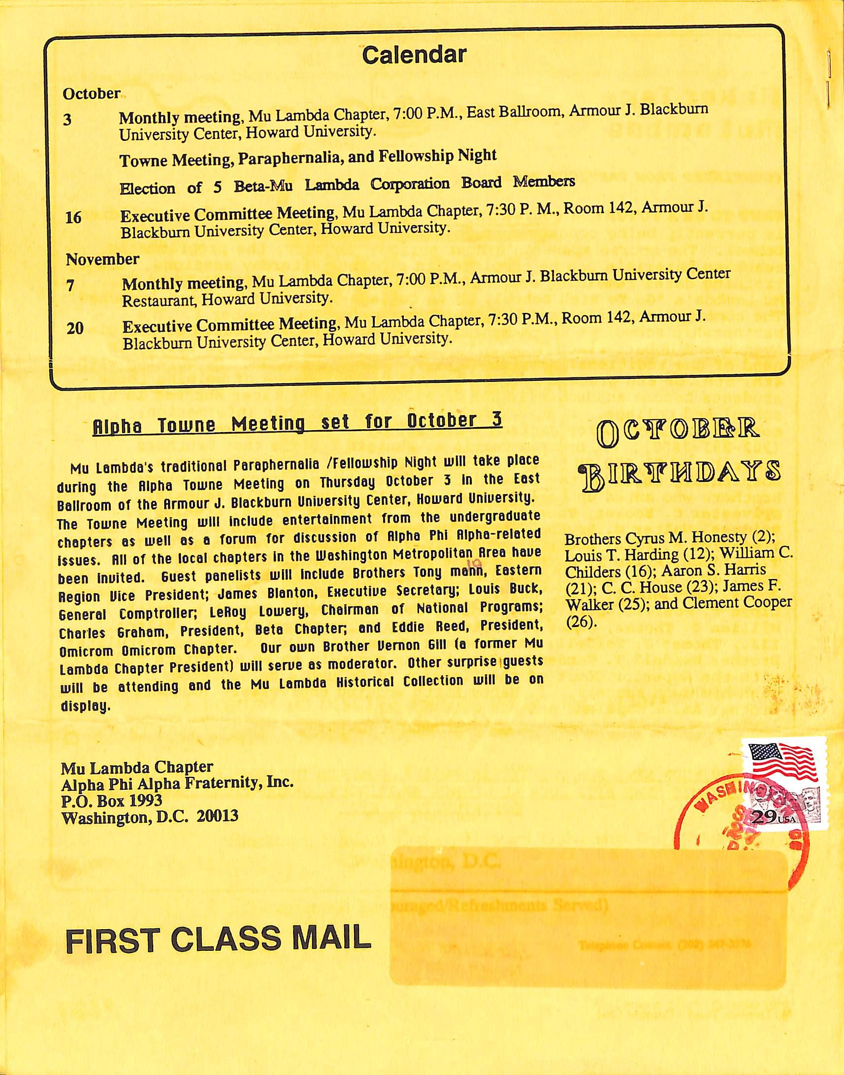 Brothers Cyrus M. Honesty (2); Louis T. Harding (12); William C. Childers (16); Aaron S. Harris (21); C. C. House (23); James F. Walker (25); and Clement Cooper chapters as well as a issues.AllofthelocalchaptersIntheWashingtonMetropolitanAreahaue been inuited. Buest panelists will include Brothers Tony manri, Eastern RegionUicePresident;domesBlanton,EKecutiueSecretary;LouisBuck, Benerel Comptroller; LeRog Lowery, Chairman of National Programs; Charles Graham. President, Beta Chapter^ and Eddie Reed, President. Omlcrom Omicrom Chapter. Our own Brother Uemon Gill (a former Mu LambdaChapterPresident)willsemeasmoderator.Othersurpriseiguests will be attending and the Mu Lambda Historical Collection will be on display. (26).