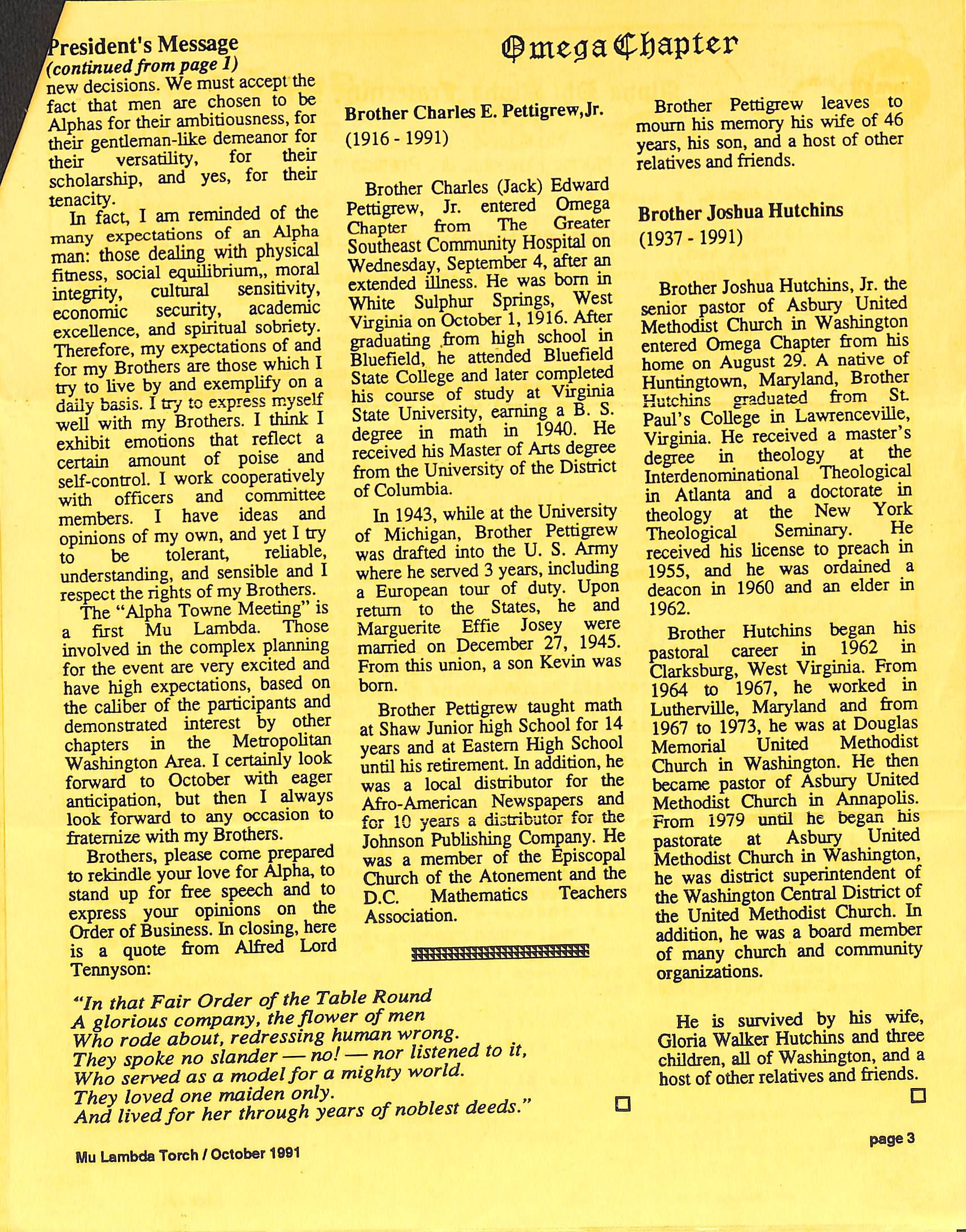 Brother Charles (Jack) Edward Pettigrew. Jr. entered toega Joshua Hutchins Chapter from The Oreater Southeast Community Hospital on Wednesday, September 4, after dn extended illness. He was bom in White Sulphur Springs, West Virginia on October 1, 1916. After graduating .from high school in Bluefield, he attended Bluefield State College and later complete^ his course of study at Virginia State University, earning aB. S. degree in math in 1940. He received his Master of Arts degree from the University of the District of Columbia.
