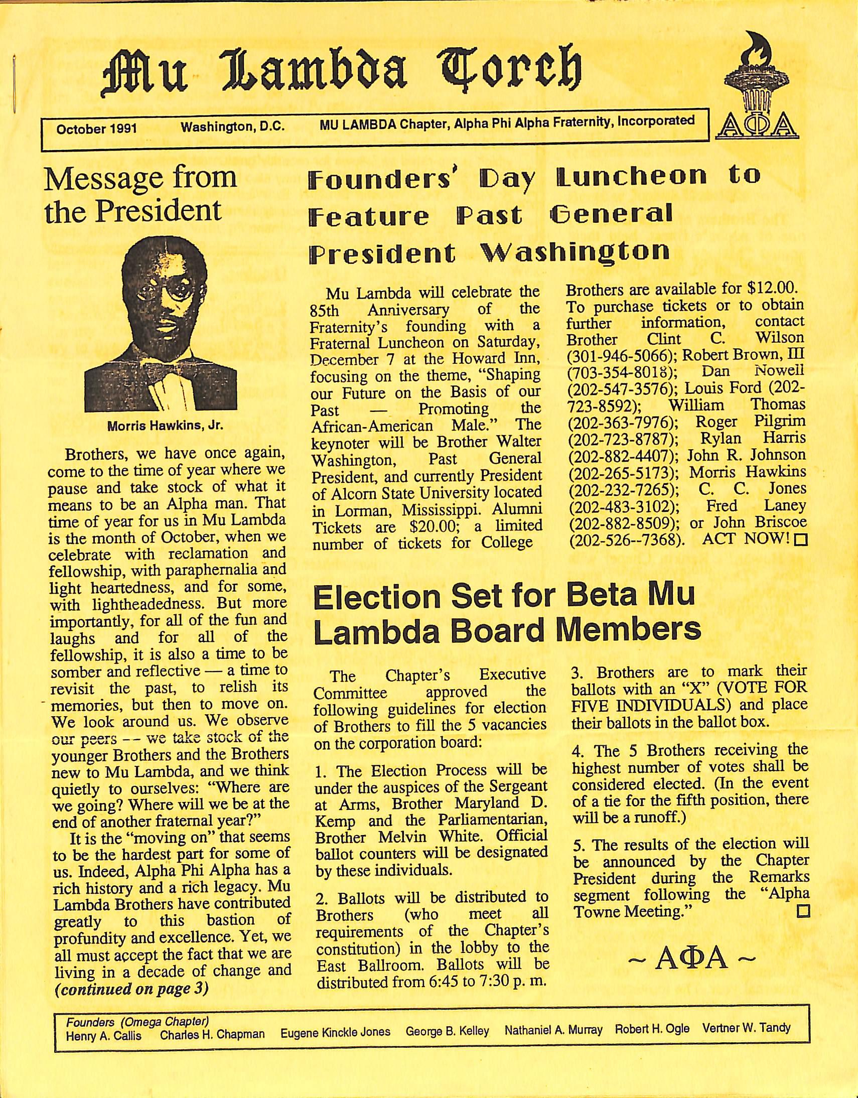 Brothers, we have once again, come to the time of year where we pause and take stock of what it means to be an Alpha man. That time of year for us in Mu Lambda is the month of October, when we celebrate with reclamation and fellowship, with paraphernalia and light heartedness, and for some, with lightheadedness. But more importantly, for all of the fun and laughs and for all of the fellowship, it is also atime to be somber and reflective —atime to revisit the past, to reUsh its ■memories, but then to move on. We look around us. We observe our peersyounger Brothers and the Brothers new to Mu Lambda, and we think quietly to ourselves: “Where are we going? Where will we be at the end of another fraternal year?”