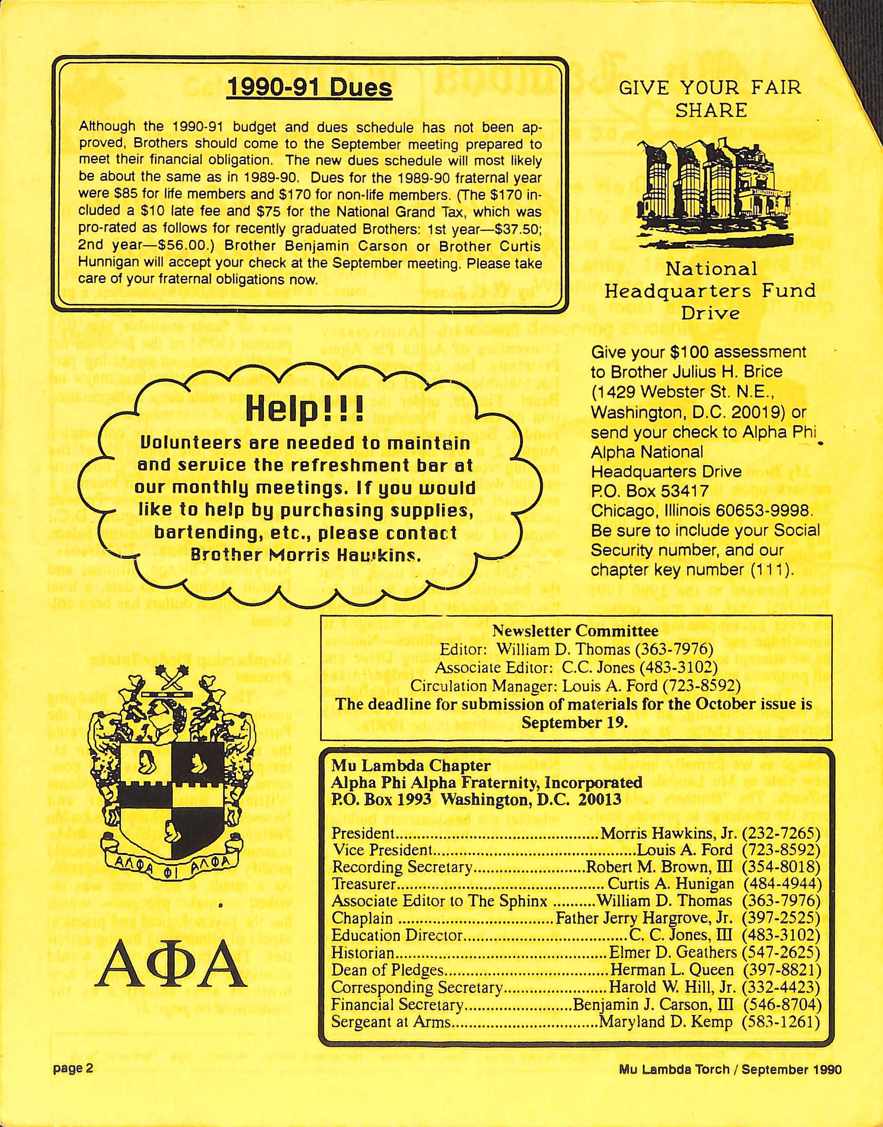 Although the 1990-91 budget and dues schedule has not been ap¬ proved, Brothers should come to the September meeting prepared to meet their financial obligation. The new dues schedule will most likely be about the same as in 1989-90. Dues for the 1989-90 fraternal year were $85 for life members and $170 for non-life members. (The $170 in¬ cluded a$10 late fee and $75 for the National Grand Tax, which was pro-rated as follows for recently graduated Brothers: 1st year—$37.50; 2nd year—$56.00.) Brother Benjamin Carson or Brother Curtis Hunnigan will accept your check at the September meeting. Please take care of your fraternal obligations now.