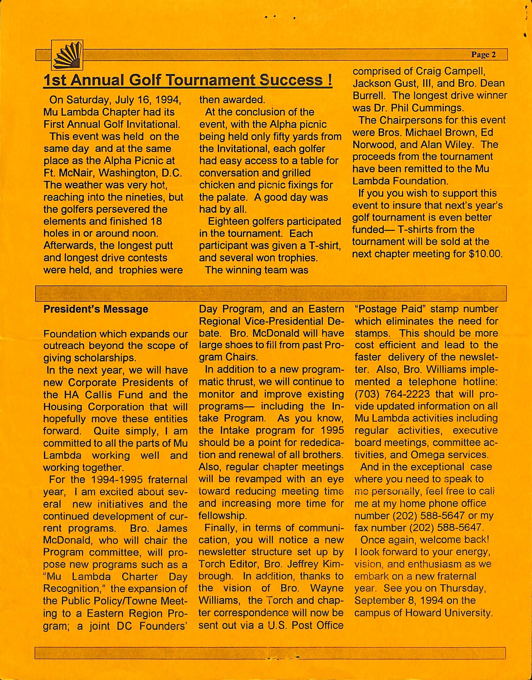 On Saturday, July 16, 1994, Mu Lambda Chapter had its First Annual Golf Invitational. This event was held on the same day and at the same place as the Alpha Picnic at Ft. McNair, Washington, D.C. The weather was very hot, reaching into the nineties, but the golfers persevered the elements and fi nished 18 holes in or around noon.