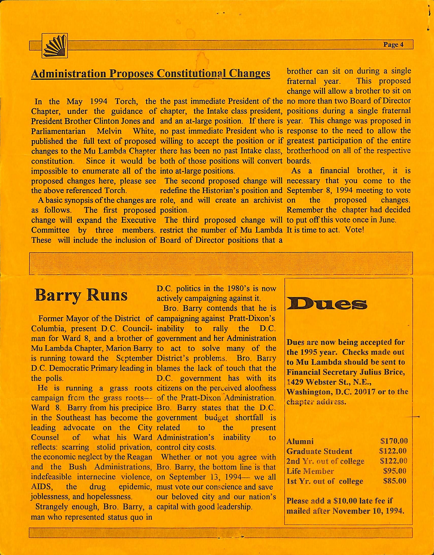 In the May 1994 Torch, the the past immediate President of the no more than two Board of Director Chapter, under the guidance of chapter, the Intake class president, positions during asingle fraternal President Brother Clinton Jones and and an at-large position. If there is year. This change was proposed in Parliamentarian Melvin White, no past immediate President who is response to the need to allow the published the full text of proposed willing to accept the position or if greatest participation of the entire changes to the Mu Lambda Chapter there has been no past Intake class, brotherhood on ail of the respective constitution. Since it would be both of those positions will convert boards, impossible to enumerate all of the into at-large positions, proposed changes here, please see The second proposed changewillnecessary that you cometothe redefine the Historian’s position and September 8, 1994 meeting tovote Abasic synopsis ofthe changes are role, and will create an archivist on the proposed changes, as follows. The first proposed position, change will expand the Executive The third proposed changewillto put off this vote once in June. Committee by three members, restrict the number of Mu Lambda It is time to act. Vote! These will include the inclusion of Board of Director positions that a