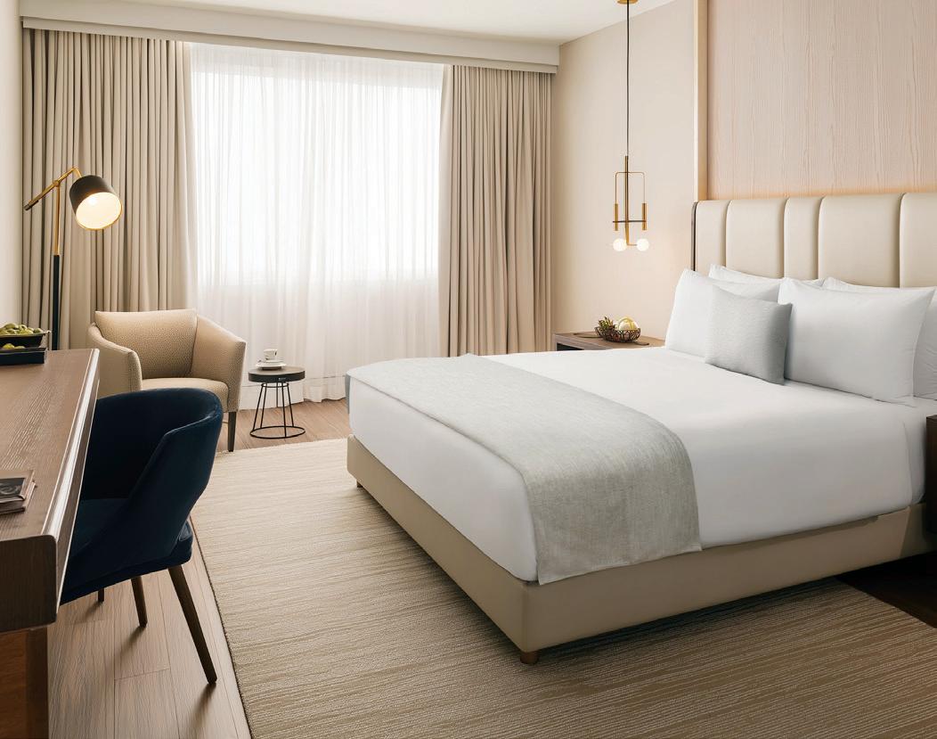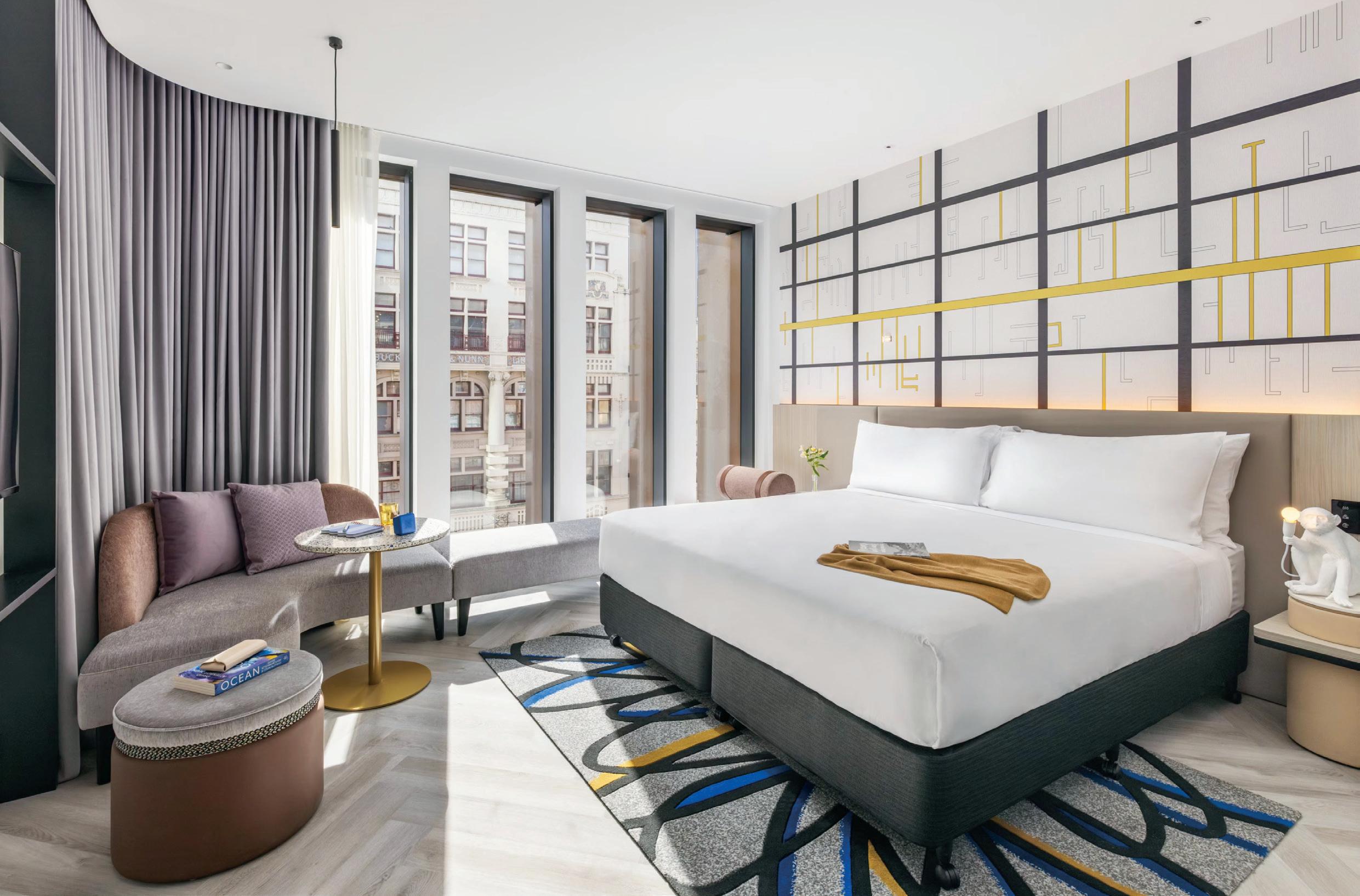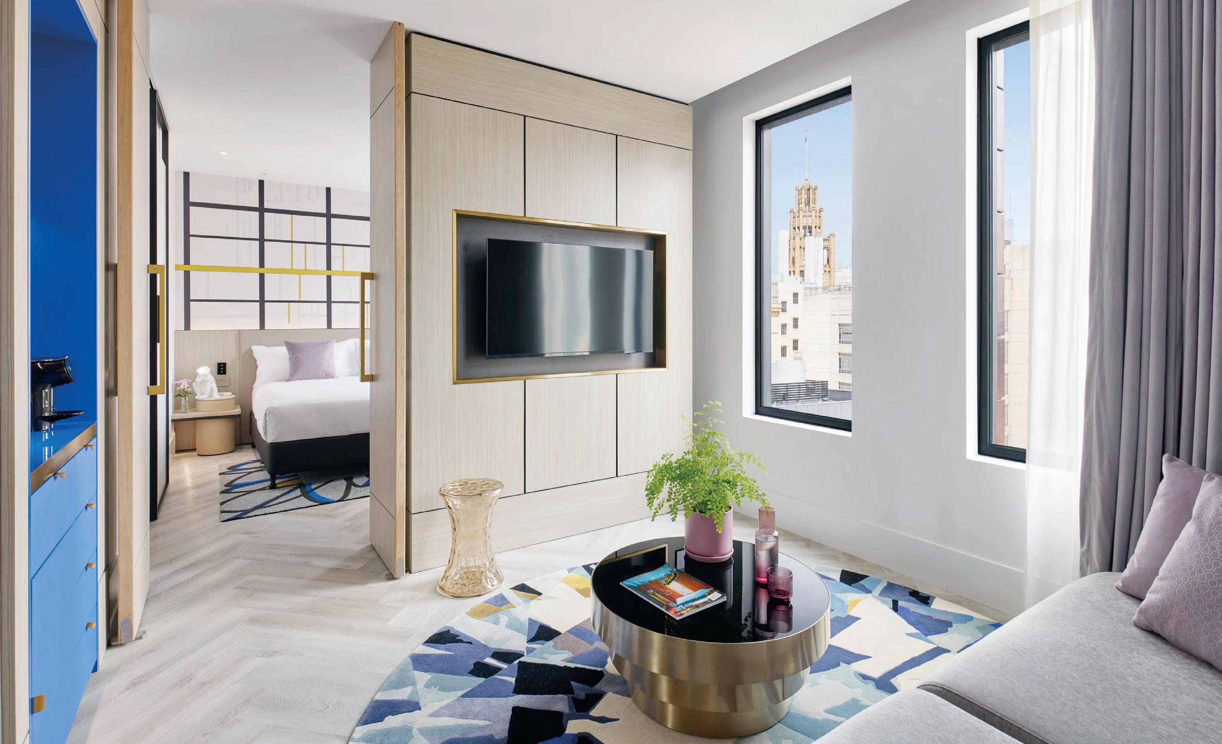 “Another is classic patterns and textures—pinstripes, stripes of all shapes and sizes, gingham check, houndstooth to name a few. They are iconic, timeless and always a great feature for hotel rooms. If