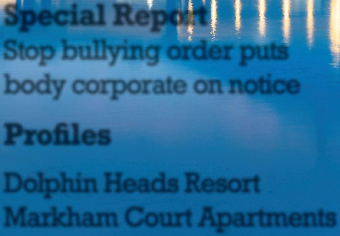 profiles • spotlights • special report • body corporate matters management • industry news • legal • finance and accounting Special Report Stop bullying order puts body corporate on notice Pro les Dolphin Heads Resort Markham Court Apartments