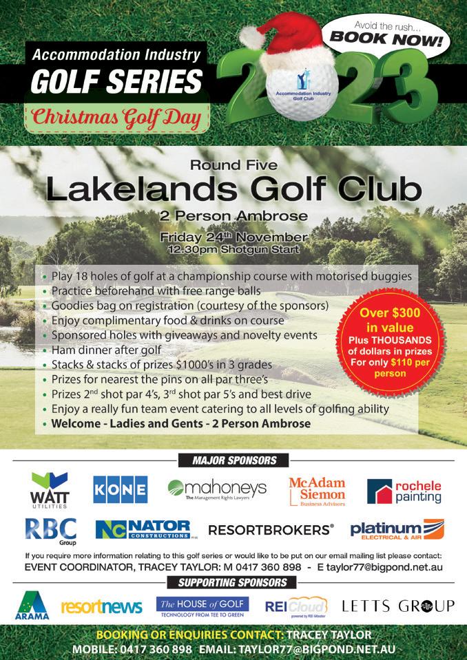 not feeling the same way about the beautiful country anymore. While I’m penning this, our dedicated crew is currently soaking up wisdom and forging connections at the HICAP 2023 event in Sydney. And guess what? We’re also making waves as exhibitors at NoVacancy Hotel + Accommodation Industry Expo - the ultimate playground for all things hospitality. I’ve got the honour of moderating a panel at the Small Hotelier Summit alongside Kelley Rigby and among all the industry rockstars, she is sure to shine. At these events, I have the sheer privilege of wearing both the AccomNews and Resort News hats. When I get to rub shoulders with the crème de la crème of the national accommodation industry, I love to share how special and unique our management rights sector is. I shout from the rooftops about its allure and the boundless opportunities it offers. And locally? Make sure to mark