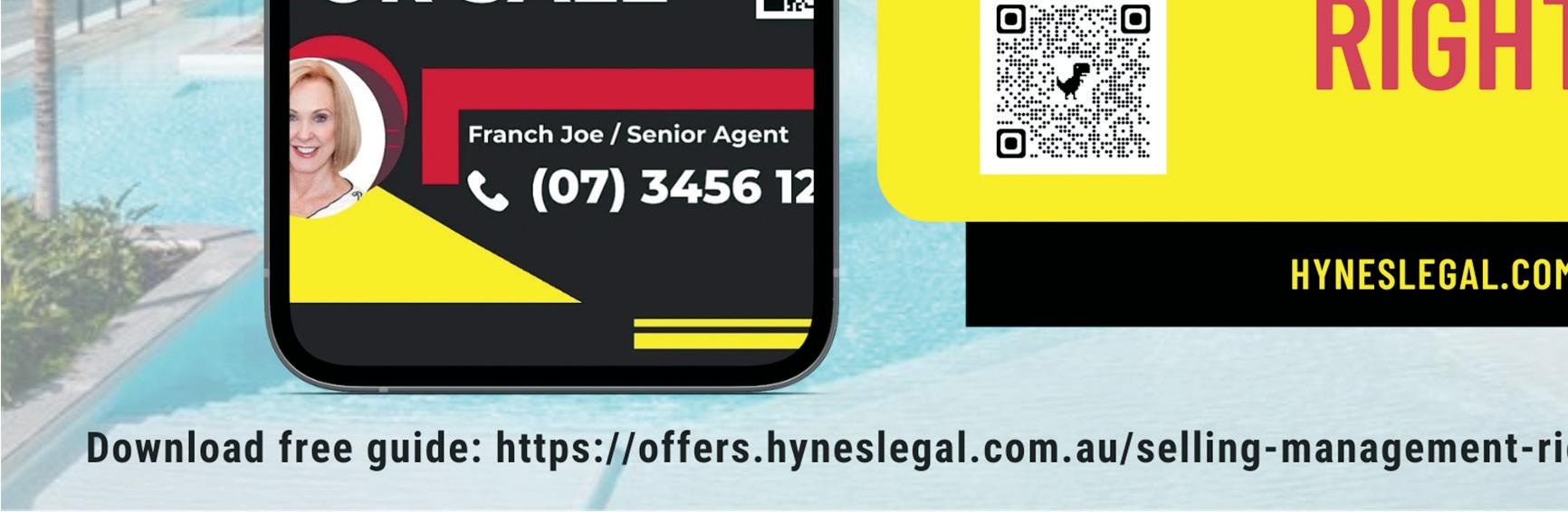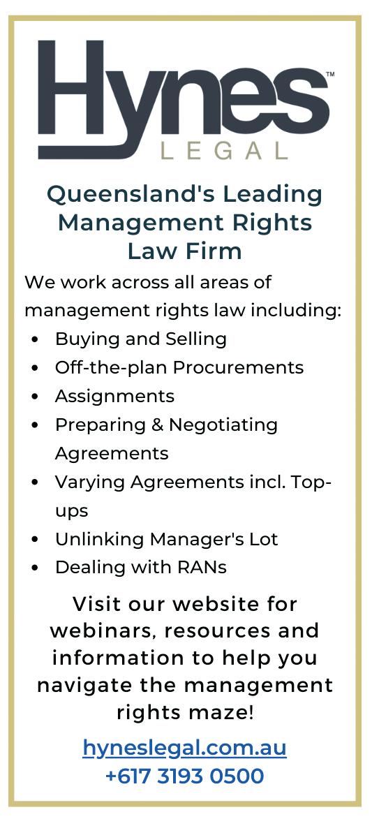 55 October 2023 PREFERRED SUPPLIER DIRECTORY VALUERS - REAL ESTATE Alex McCowan 0417 405 115 or Alison Sun 0416 181 285 admin@accomvaluers.com.au www.accomvaluers.com.au Valuations for all purposes - National Coverage Major Lenders - Consultancy - COVID-19 Advice WHEN EXPERIENCE MATTERS The only specialist Management Rights valuation company in Australia (with 25 years experience) TRAINING & DEVELOPMENT REAL ESTATE LICENSING COURSES 1800 080 349 Classes from Coolangatta to Cairns www.propertytraining.com.au LIVE CLASSES at Logan Central or Anywhere via Zoom Professional Real Estate Training Since 2006 Resident Letting Agent Licence Course Real Estate Agent Full Licence Course Conducted LIVE by Friendly, Experienced Industry Trainers ENROL Today (07) 3878 8513 RTO Number 31303 email info@pret.com.au visit www.pret.com.au Bonus FREE CPD Workshops & Ongoing Support for Graduates Valued up to $2000 per annum (conditions apply) AUSTRALIA PRE T ...then you’re losing the advantage. If you’re not reading... Registered Australia No. 100023799 TheMonthlyMagazineforAccommodationIndustryProfessionals www.accomnews.com.au Issue322 June2023 $13.75inc.GST www.hotelinteriors.com.au info@hotelinteriors.com.au 1300 055 Custommadefurnitureincludingpackages SPECIALISTS IN ACCOMMODATION FURNITURE FF&E AND JOINERY DennisClark profiles spotlights specialreport bodycorporatematters management industrynews legal financeandaccounting Special Report The high price of border wars in strata Pro les Coral Beach Noosa Resort Perfect match in Suncoast syndicate Registered AustraliaPost 100023799 TheMonthlyMagazineforAccommodationIndustryProfessionals www.accomnews.com.au Issue320 April2023 $13.75inc.GST ...then you’re losing the advantage. Ensure you have the ‘Resort News Advantage’ with a team of highly skilled industry professionals covering all the critical topics that a ect your accommodation property. Subscribe now to ensure you don’t miss another issue of this leading monthly industry journal. CALL FOR SUBSCRIPTIONS 07 5440 5322 If you’re not reading... TheMonthlyMagazineforAccommodationIndustryProfessionals www.accomnews.com.au $13.75 www.hotelinteriors.com.au info@hotelinteriors.com.au 1300876 Custom adefurniture cludingpackages SPECIALISTS IN ACCOMMODATION FURNITURE FF&E AND JOINERY CEO, Clark SpecialReportThe high price of border wars in strata Pro les Coral Beach Noosa Resort Perfect match in Suncoast syndicate Registered Australia 100023799 TheMonthlyMagazineforAccommodationIndustryProfessionals Issue320 April2023 $13.75inc.GST Registered Australia Print 100023799 TheMonthlyMagazineforAccommodationIndustryProfessionals 321 May2023 $13.75inc. www.hotelinteriors.com.au info@hotelinteriors.com.au 876055 CustommadefurnitureincludingpackagesSPECIALISTS IN ACCOMMODATION FURNITURE FF&E AND JOINERY profiles spotlights specialreport bodycorporatematters management industrynews legal financeandaccounting SpecialReport Stopbullyingorderputs bodycorporateonnotice Pro les DolphinHeadsResort MarkhamCourtApartments PREFERRED SUPPLIER SPOTLIGHT Look for the sign of an Industry Specialist... accomnews.com.au/business-directory SUNSHINE COAST & QUEENSLAND WIDE • Commercial Law • Business Law • Property Law • Litigation & Disputes • Retirement Villages • Wills & Estate Planning • Body Corporate One of the Sunshine Coast’s most experienced firms in on-site management rights transactions. simpsonquinn.com.au Damian Quinn Isabella Mansell (07) 5443 5266 Look for the sign of an Industry Specialist... www.accomnews.com.au/business-directory