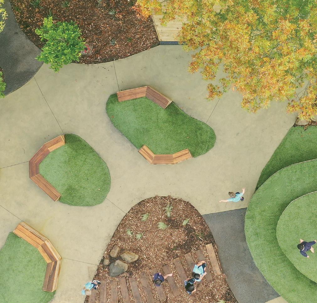 use of concrete and artificial turf,” Ms Croll said. “The natural materials and planting help nestle and ground the elements, and create cohesion with the landscape. The mix of natural materials introduces sensory elements for the children to