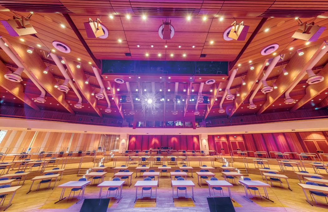 can be controlled via sounddampening materials, the shape of the auditorium and stage, and the height of the ceiling.