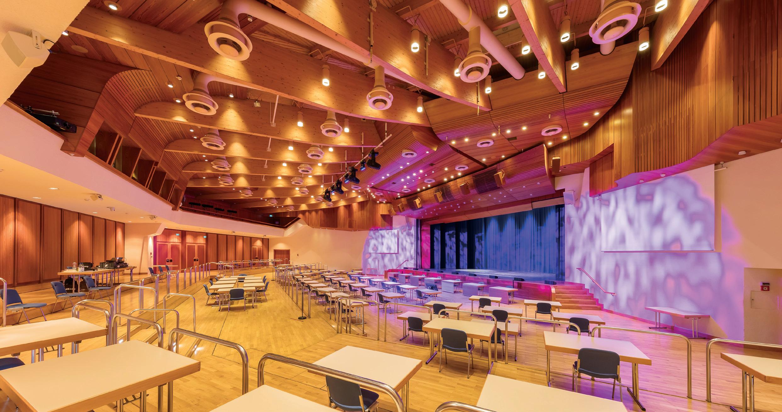 “Large spaces like auditoriums and gymnasiums present challenges due to their size and high occupancy. To ensure optimal sound quality, acoustic design should be considered, including the use of diffusers, absorbers, and reflective surfaces. Installing professionalgrade audio systems, including microphones, amplifiers, and speakers, designed specifically for large spaces can ensure even sound coverage and clarity. Portable sound-absorbing panels or curtains can also be strategically placed to reduce reverberation and