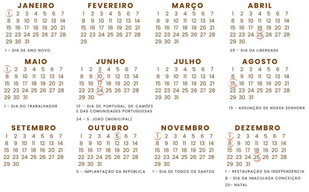 – AÑO NUEVO 25 – DÍA DE LA LIBERTAD 1 – DÍA DEL TRABAJADOR 10 – DÍA DE PORTUGAL, DE CAMÕES Y DE LAS COMUNIDADES PORTUGUESAS 24 – S. JOÃO (MUNICIPAL) 15 – ASSUNCIÓN DE NUESTRA SEÑORA