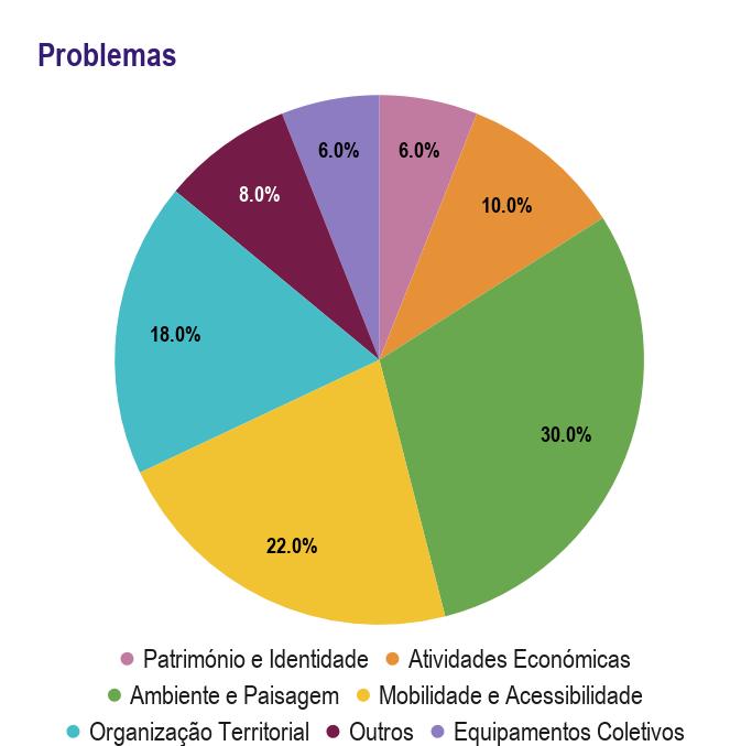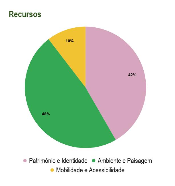 Os participantes identificaram três grandes temas como recursos: Ambiente e Paisagem (48%), Património e Identidade (42%) e Mobilidade e Acessibilidade (12%).