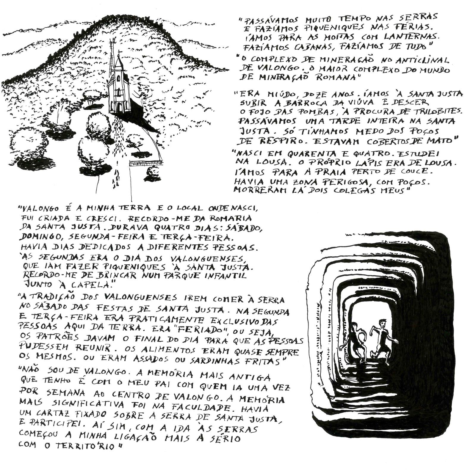 Por fim, as serras e as romarias A ligação à serra era muito forte. «Passávamos muito tempo na serra e fazíamos piqueniques nas férias», «íamos para as moitas com lanternas e fazíamos cabanas» Mesmo os mais jovens iam «à Santa Justa subir a Barroca da Viúva e descer o Fojo das Pombas, à procura de trilobites». Os perigos eram vários, sobretudo os «poços de respiro», pois «estavam cobertos de mato». É em Valongo que existe o maior complexo do mundo de mineração romana subterrânea ligada ao ouro.
