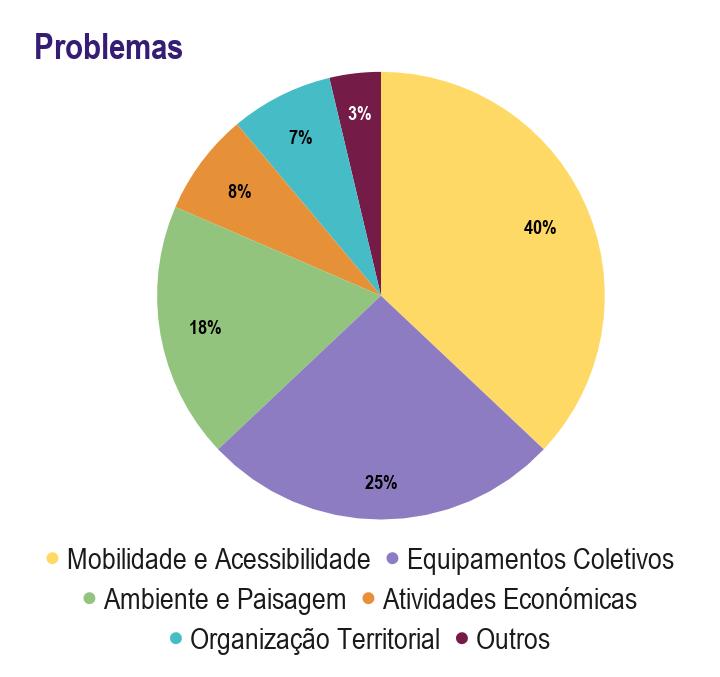 Relativamente aos problemas apontados, a maioria enquadrou-os no tema Mobilidade e Acessibilidade (40%), face à falta de passeios e acessibilidade pedonal (nas estradas nacionais) e ao pouco investimento da Infraestruturas de Portugal na EN15. No tema Equipamentos Coletivos (25%), os participantes referiram a falta de condições no centro de saúde e o fecho das urgências no hospital. Ambiente e Paisagem (18%) surge como o terceiro tema mais referenciado, com destaque para os problemas das espécies invasoras, da poluição do rio, do lixo nas serras e do impacto dos desportos motorizados em zonas sensíveis.