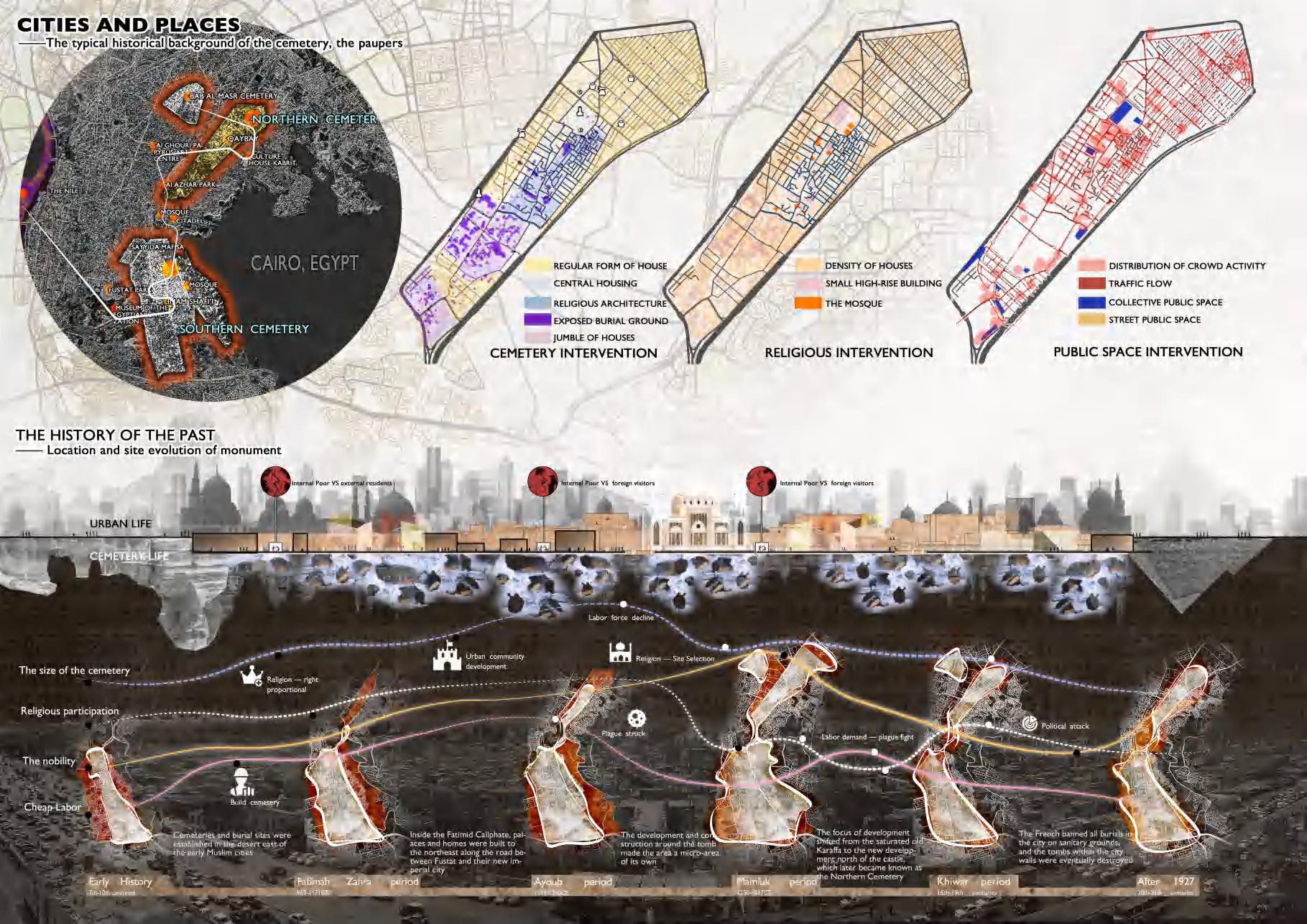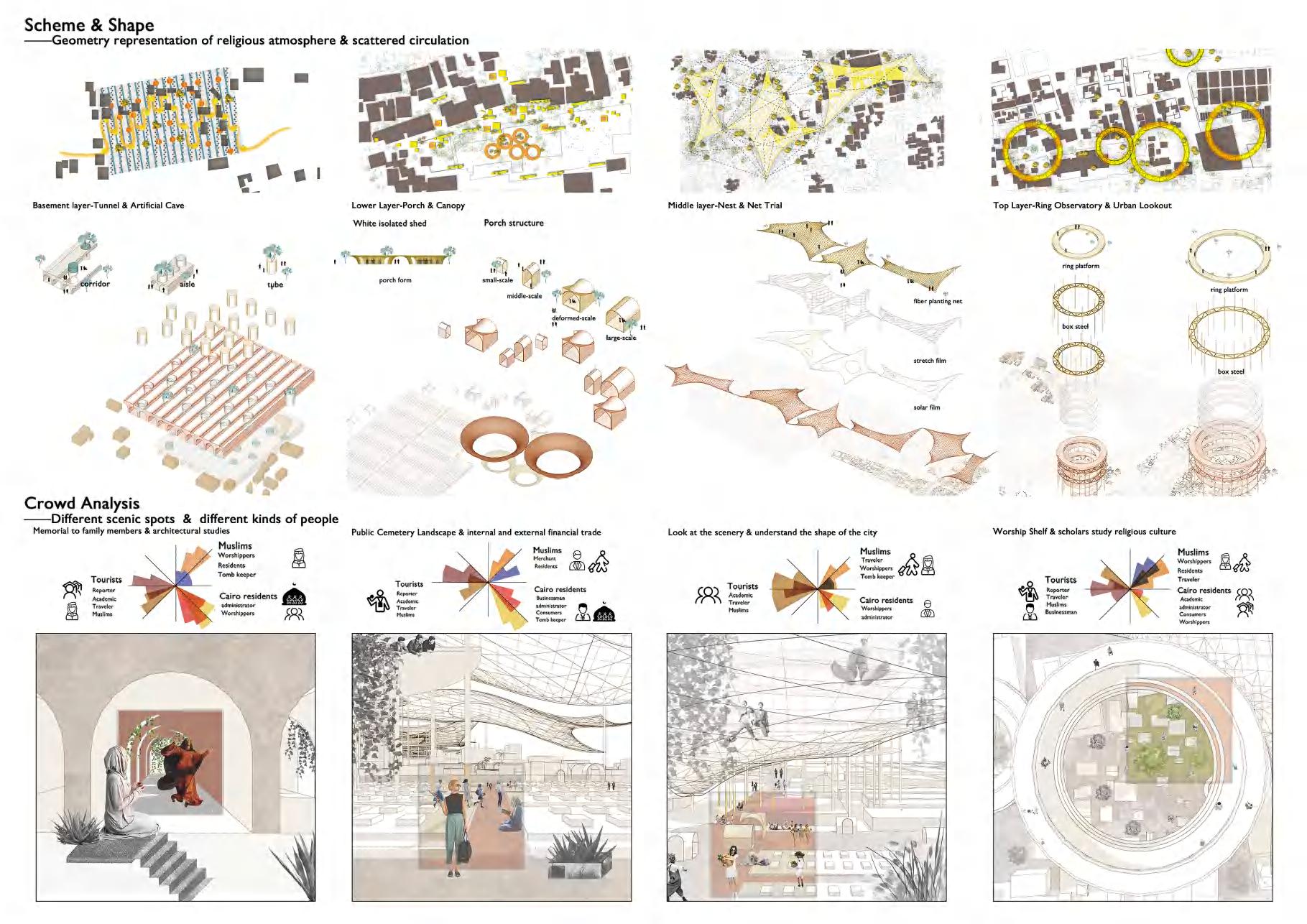 The project is located in the stagnant neighbourhood of the dead in Cairo, Egypt. This design takes the common belief in Islam as the design starting point, and combines the Muslim belief "Heavenly Garden" with the transformation of landscape architecture, aiming to integrate historical traces with modern slums, eliminate the boundary of the site, and blur the boundary between the rich and the poor to promote the development of urban fringe areas. The design retains the form of the existing house-style cemetery, repairs the underground cemetery area, increases the activity space and planting area, and creates a vertical landscape to establish a worship platform of common beliefs to stimulate the vitality of the site.