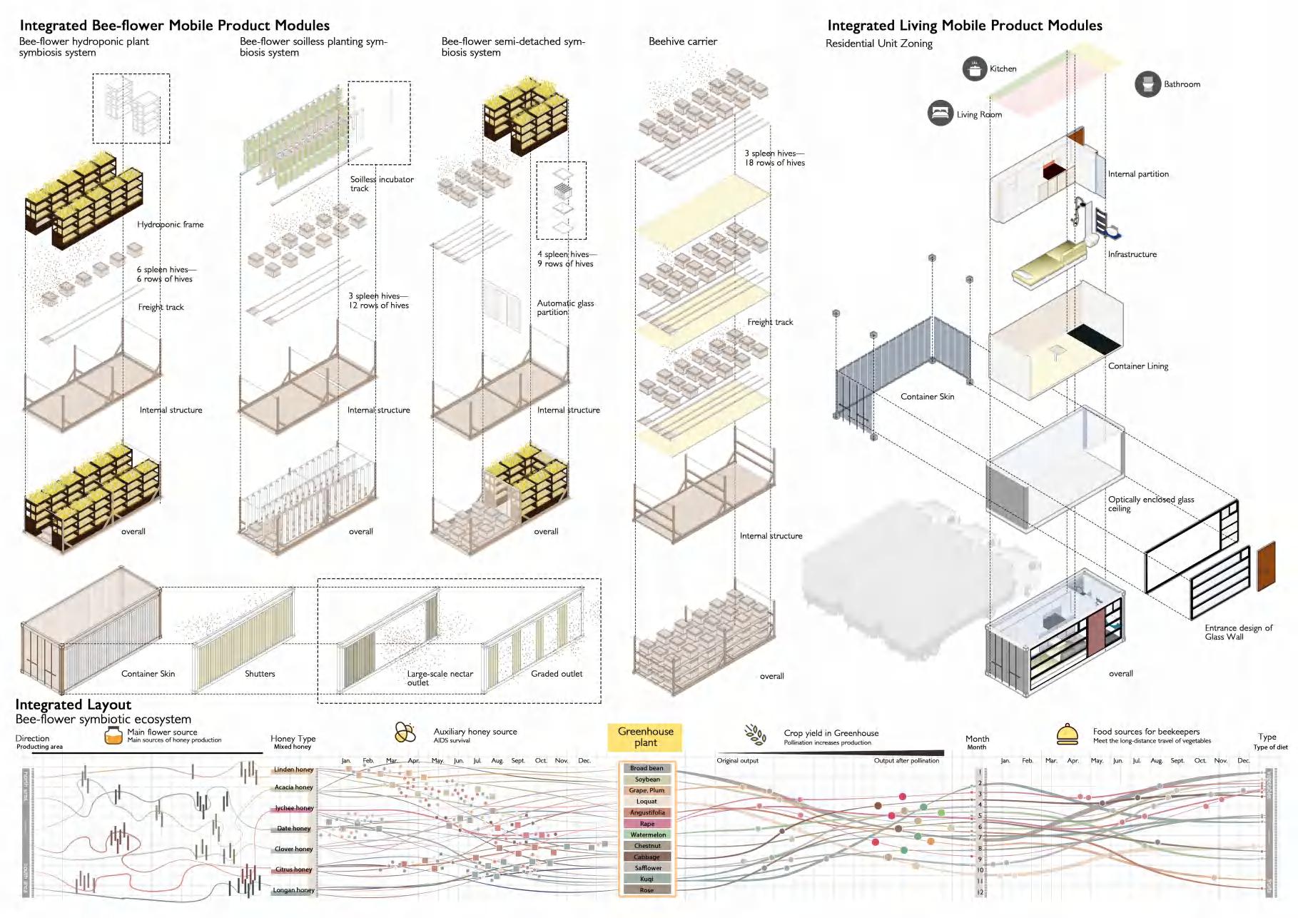 From the perspective of the "modern nomads"——beekeepers, the project puts forward the landscape design of "mobile container beekeeping base" through extensive research on their lifestyles and production methods to improve the need for beekeepers to move around all the year round. At the same time, it provides a big data platform to ensure the quality of honey throughout the country and provide highquality sales channels.The aims is to solve the problem of the honey industry being affected by the natural climate, improving the living life of beekeepers and achieving the continuous operation of their beekeepers.