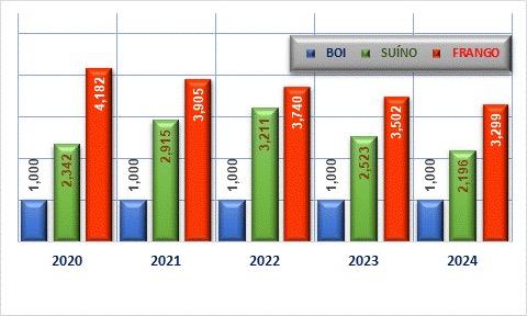quinquênio, pois, em relação a 2020, alcançou em 2024 valor apenas 13% superior. O frango vivo teve desempenho um pouco melhor, sua cotação média valorizando-se perto de 21%.