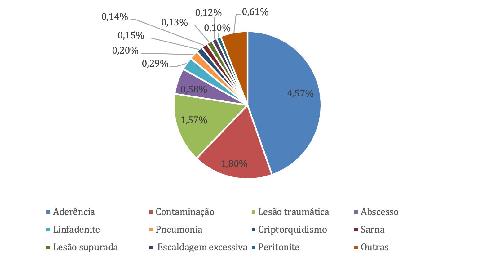 Figure 3 Causas de condenações/desvios de carcaças em suínos abatidos no Brasil entre 2012 e 2014. Adaptado de Adaptado de Modernização da inspeção sanitária em abatedouros de suínos - inspeção baseada em risco. Opinião científica / Jalusa Deon Kich ... [et al.]. - Concórdia : Embrapa Suínos e Aves, 2019