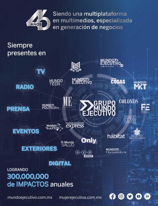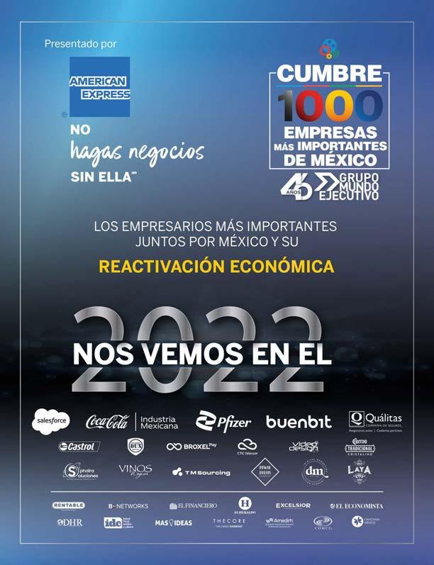 1000 EMPRESAS MÁS IMPORTANTES DE MÉXICO MUNDO EJECUTIVO año 2021 ®. Diciembre 2021-2022. Grupo Mundo Ejecutivo ®; Es una publicación anual de Grupo Mundo Ejecutivo®; Editada y publicada por: Grupo Internacional Editorial, S.A. de C.V., Oficinas Generales: Río Nazas No. 34, Col. Cuauhtémoc, C.P. 06500 México, D.F. Teléfono: 5002-9500 www.mundoejecutivo.mx, Editor Responsable: Arlenne Muñoz Vilchis. Certificado de Reserva de Derechos al Uso Exclusivo número 04-2002-060617140200-102. Certificado de Licitud de Título número 6547, Certificado de Licitud de Contenido número 6938 ambos otorgados por la Comisión Calificadora de Publicaciones y Revistas Ilustradas de la Secretaría de Gobernación. Permiso SEPOMEX: PP09 – 0225. Se imprime en Impregrafica Digital, S.A. de C.V., Av. Coyoacán 100-D Valle Norte, Benito Juárez, C.P. 03103, CDMX. Tiraje impreso 51,000 ejemplares. Los artículos firmados son responsabilidad de sus autores y no reflejan necesariamente el punto de vista del editor de la publicación o de Grupo Mundo Ejecutivo®. Queda estrictamente prohibida la reproducción total o parcial de los contenidos e imágenes de la publicación sin previa autorización de Grupo Internacional Editorial, S.A. de C.V. © Grupo Internacional Editorial, S.A. de C.V. © investiga sobre la seriedad de sus anunciantes, pero no se responsabiliza con las ofertas relacionadas por los mismos. Esta es una publicación sólo para adultos.