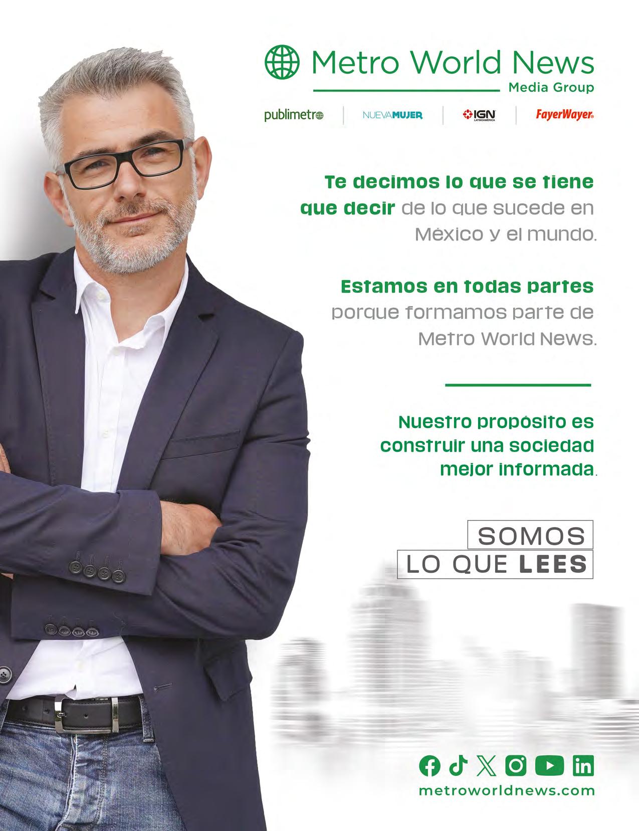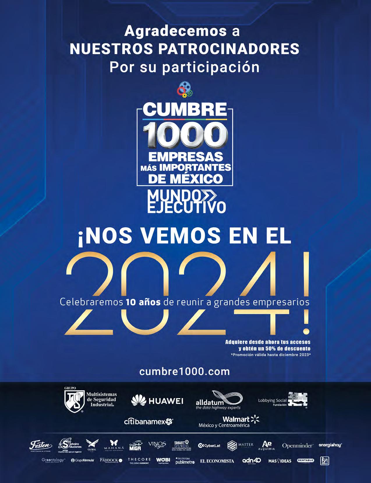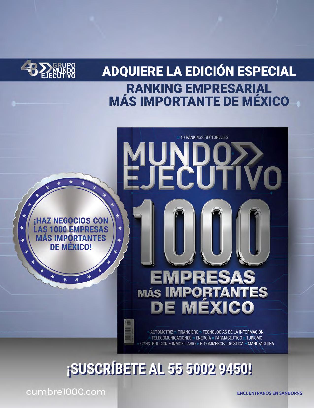 MIL EMPRESAS MÁS IMPORTANTES DE MÉXICO MUNDO EJECUTIVO Año 2023 ® Número 027 Diciembre 2023-2024. Es una publicación mensual de Grupo Mundo Ejecutivo®; Editada y publicada por: Grupo Internacional Editorial, S.A. de C.V., Oficinas Generales: Río Nazas No. 34, Colonia. Cuauhtémoc, Alcaldía Cuauhtémoc, C.P. 06500, Ciudad de México, Teléfono: 55 5002-9400, www.mundoejecutivo.com.mx, Editor Responsable: Rosa Arlenne Muñoz Vilchis. Certificado de Reserva de Derechos al Uso Exclusivo número 04-2002-060617140200-102. Certificado de Licitud de Título número 6547, Certificado de Licitud de Contenido número 6938 ambos otorgados por la Comisión Calificadora de Publicaciones y Revistas Ilustradas de la Secretaría de Gobernación. Permiso SEPOMEX: PP09 – 0225. Se imprime en SMARTPRESS VISION, S.A. DE C.V., Caravaggio 30, Col Mixcoac, CDMX C.P. 03910, TEL 55 5611 8060. Tiraje impreso 51,000 ejemplares. Los artículos firmados son responsabilidad de sus autores y no reflejan necesariamente el punto de vista del editor de la publicación o de Grupo Mundo Ejecutivo®. Queda estrictamente prohibida la reproducción total o parcial de los contenidos e imágenes de la publicación sin previa autorización de Grupo Internacional Editorial, S.A. de C.V. © Grupo Internacional Editorial, S.A. de C.V. © investiga sobre la seriedad de sus anunciantes, pero no se responsabiliza con las ofertas relacionadas por los mismos. Esta es una publicación sólo para adultos. Circulación certificada por el Instituto Verificador de Medio Registro No. 127/21